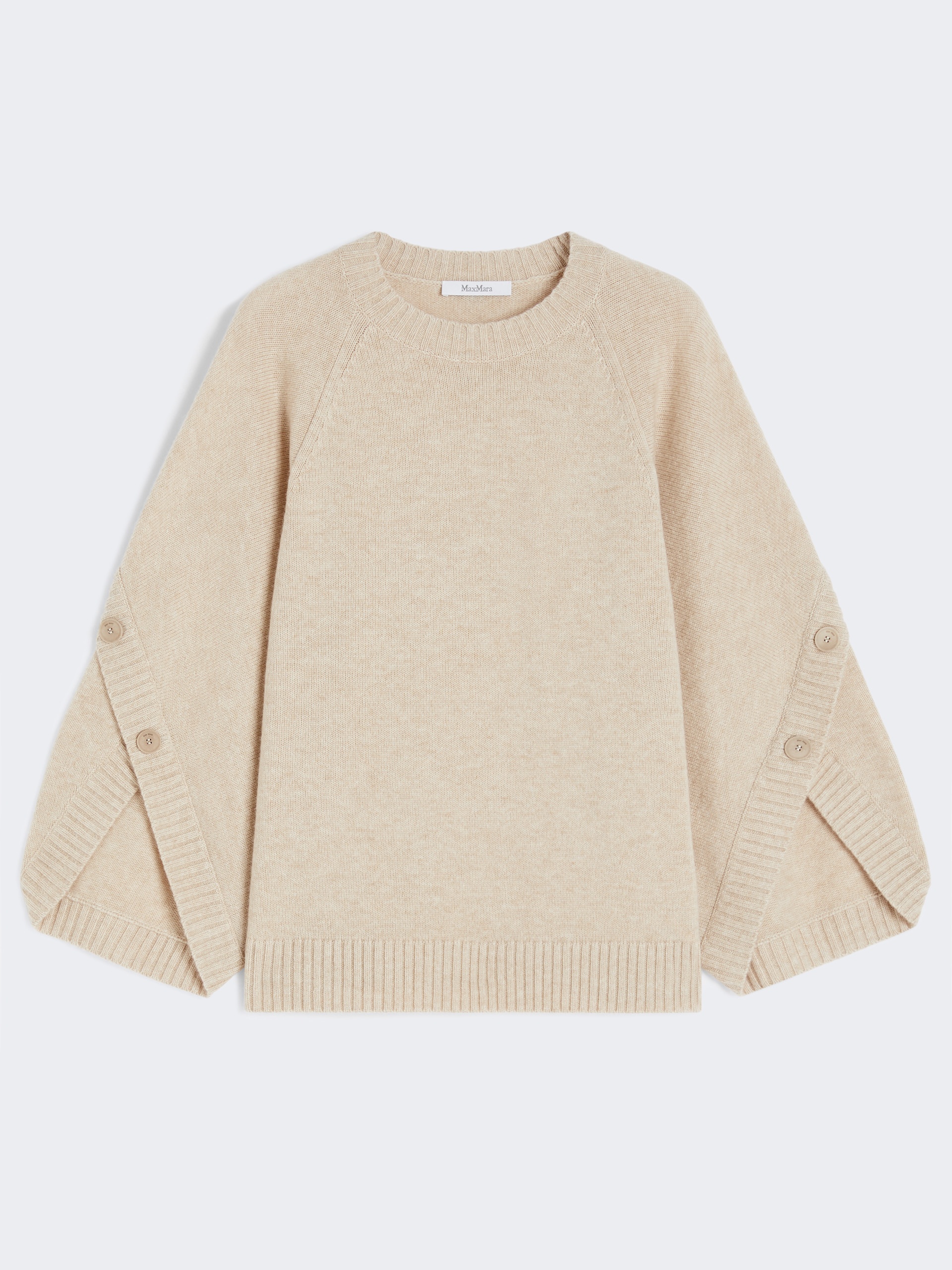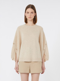 DETAILS Slightly oversized sweater featuring crossover detail and branded horn buttons on the sleeves. Stockinette-stitched wool and cashmere yarn sweater Crew neckline Loose-fitting raglan sleeves Branded horn plate on the back of the neck Ribbed hems COMPOSITION AND CARE 70% wool, 30% cashmere. Hand wash cold (40°c max); do not bleach; do not tumble dry; flat drying in the shade; cool iron; professionally dry clean perchloroethylene - mild process; do not wet clean.; iron with a cloth between.; using neutral detergent. Distributed by Max Mara S.r.l., registered office in Reggio Emilia (Italy), Via Giulia Maramotti 4, 42124 (IT)