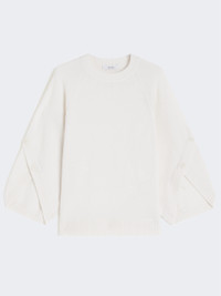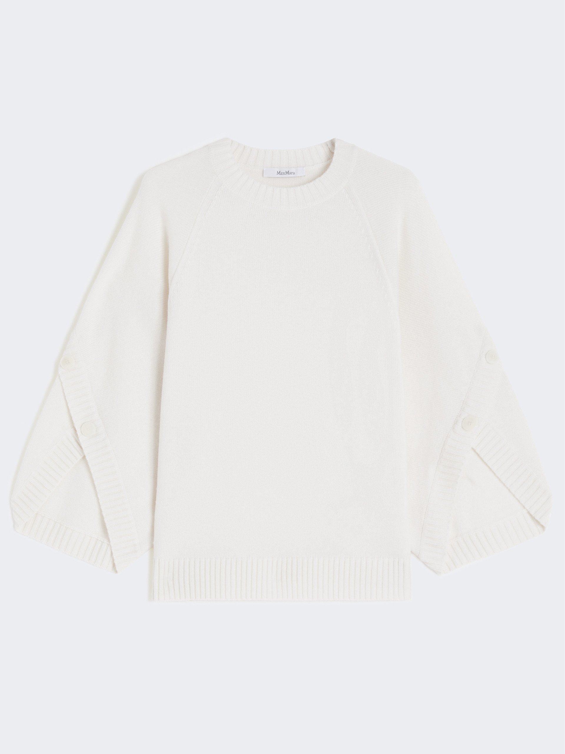 DETAILS Slightly oversized sweater featuring crossover detail and branded horn buttons on the sleeves. Stockinette-stitched wool and cashmere yarn sweater Crew neckline Loose-fitting raglan sleeves Branded horn plate on the back of the neck Ribbed hems COMPOSITION AND CARE 70% wool, 30% cashmere. Hand wash cold (40°c max); do not bleach; do not tumble dry; flat drying in the shade; cool iron; professionally dry clean perchloroethylene - mild process; do not wet clean.; iron with a cloth between.; using neutral detergent. Distributed by Max Mara S.r.l., registered office in Reggio Emilia (Italy), Via Giulia Maramotti 4, 42124 (IT)