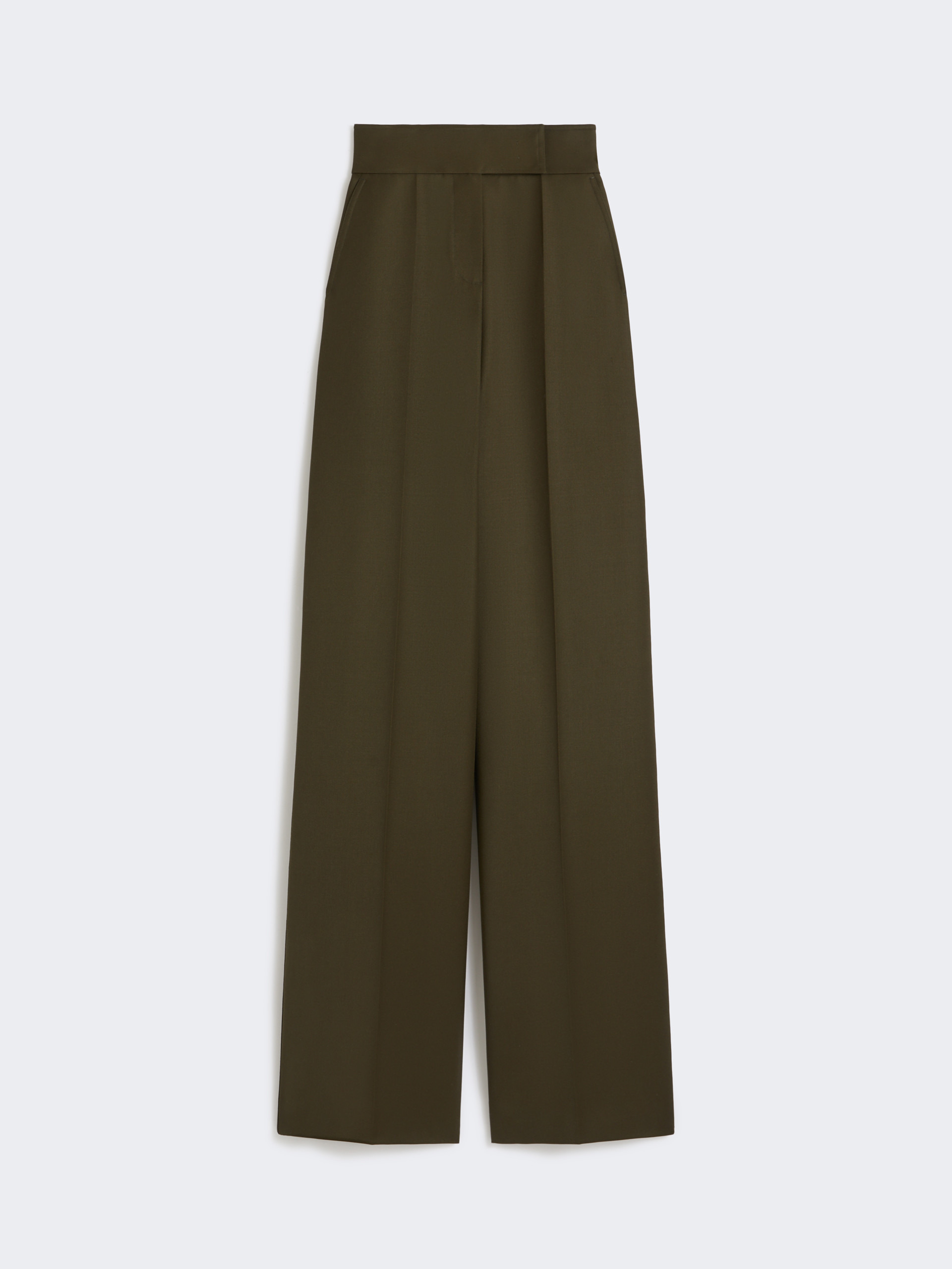 DETAILS Tailoring-inspired trousers with a high waist and wide-leg construction. Pure wool gabardine trousers Wide leg Fastening with a wide waistband tab, zip fly and small hook Side pockets Welt pockets at the back Trouser crease and darts sewn at the waist back Lined COMPOSITION AND CARE 100% virgin wool. Do not wash; do not bleach; do not tumble dry; cool iron; professionally dry clean perchloroethylene - mild process; do not wet clean. Distributed by Max Mara S.r.l., registered office in Reggio Emilia (Italy), Via Giulia Maramotti 4, 42124 (IT)