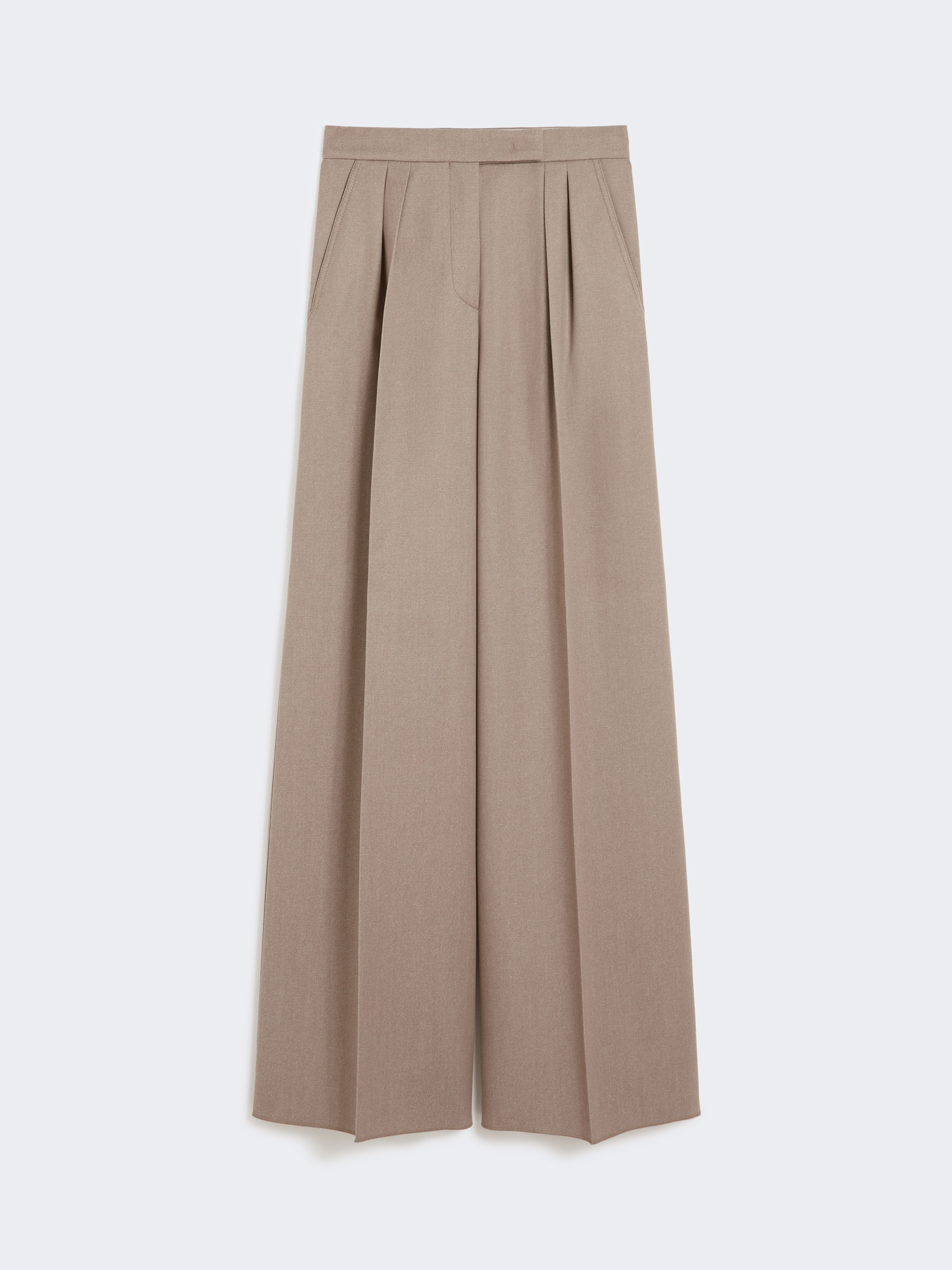 DETAILS Menswear-style trousers with double pleats on the front waist. Pure wool fabric trousers Wide leg Fastening with a wide waistband tab, zip fly and small hook Slant pockets at the sides Trouser crease COMPOSITION AND CARE 100% virgin wool. Do not wash; do not bleach; do not tumble dry; cool iron; professionally dry clean perchloroethylene - mild process; do not wet clean.; protect buttons before washing. Distributed by Max Mara S.r.l., registered office in Reggio Emilia (Italy), Via Giulia Maramotti 4, 42124 (IT)