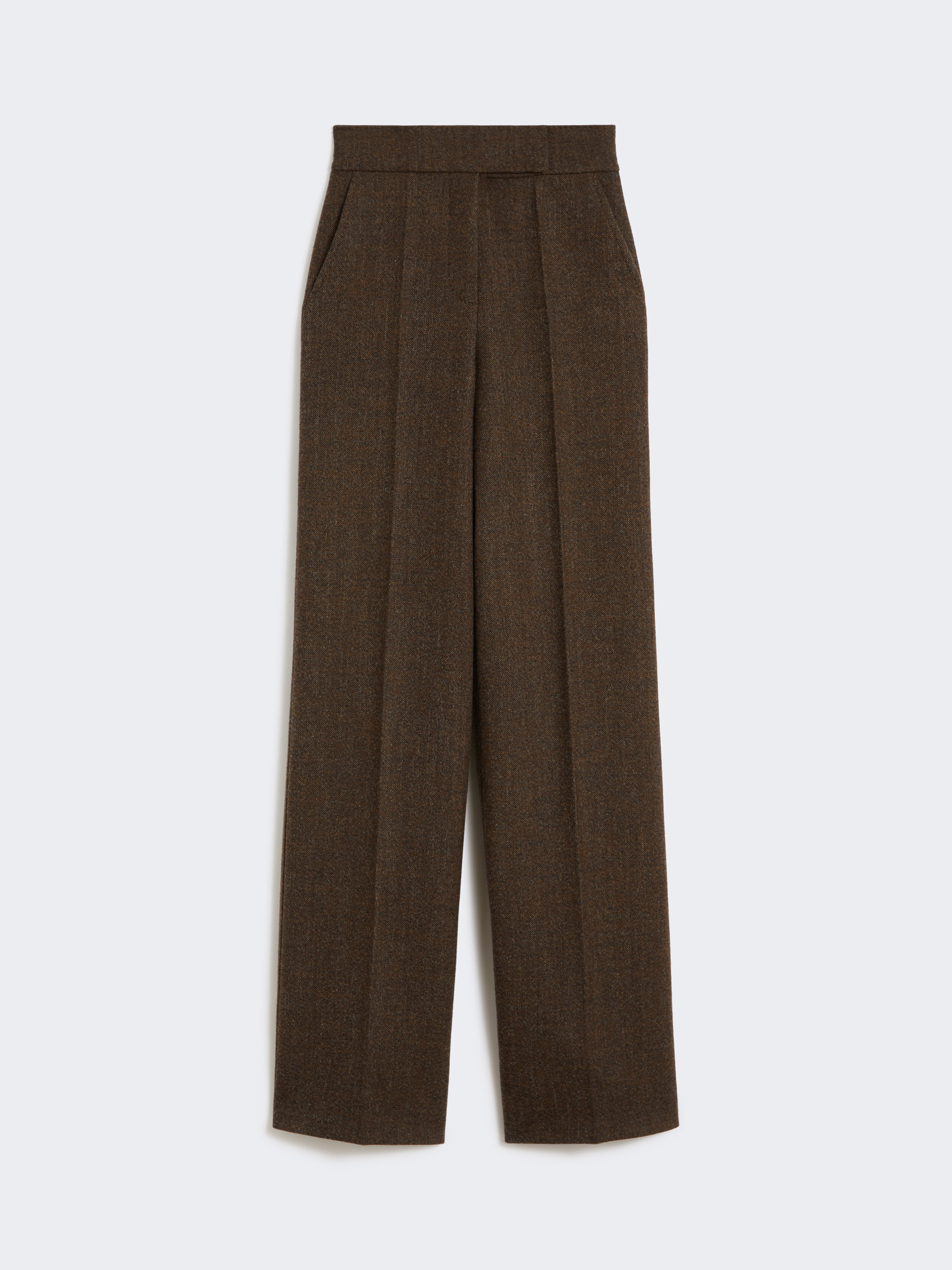 DETAILS Wide-leg trousers featuring a high-waisted tailored construction. Trousers in yarn-dyed pure wool flannel with pattern Wide leg Fastening with a wide waistband tab, zip fly and small hook Side pockets Welt pockets at the back Trouser crease and darts sewn at the waist back Lined COMPOSITION AND CARE 100% virgin wool. Do not wash; do not bleach; do not tumble dry; cool iron; professionally dry clean perchloroethylene - mild process; do not wet clean. Distributed by Max Mara S.r.l., registered office in Reggio Emilia (Italy), Via Giulia Maramotti 4, 42124 (IT)