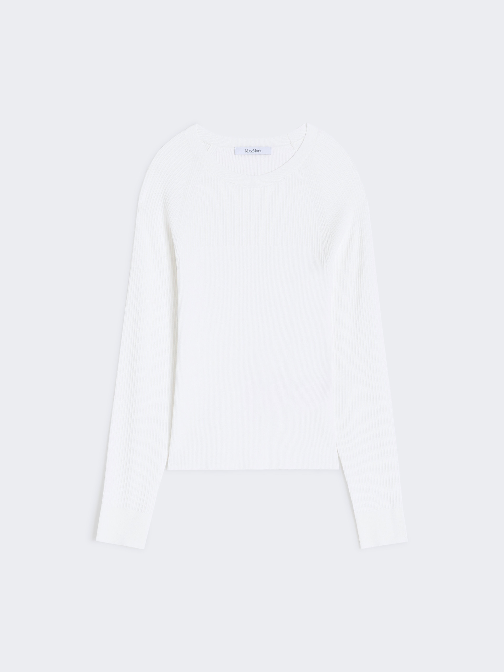 DETAILS Sweater featuring a silhouette-accentuating rib-knit pattern. Stretch technical viscose yarn sweater Slim fit Crew neckline Long raglan sleeves COMPOSITION AND CARE 83% viscose, 17% polyester. Hand wash cold (40°c max); do not bleach; do not tumble dry; flat drying in the shade; cool iron; professionally dry clean perchloroethylene - mild process; do not wet clean.; iron with a cloth between.; using neutral detergent. Distributed by Max Mara S.r.l., registered office in Reggio Emilia (Italy), Via Giulia Maramotti 4, 42124 (IT)