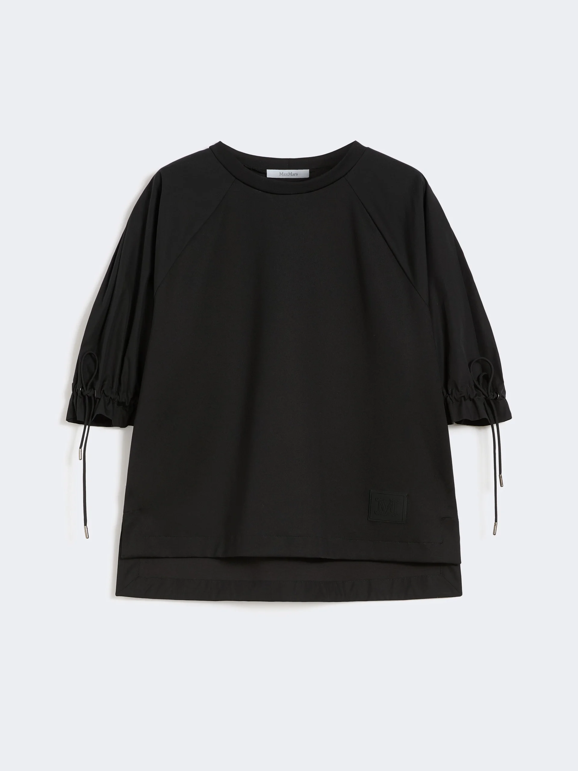 DETAILS T-shirt featuring pure cotton poplin balloon sleeves. - T-shirt in technical cotton-blend jersey fabric - Straight fit - Crew-neck - Short raglan sleeves with drawstring detail at the hem - Side slit-embellished hem - Branded rubber label on the front left-hand hem COMPOSITION AND CARE Jersey fabric 48% polyamide, 46% cotton, 6% elastane; fabric 100% cotton. Hand wash cold (40°c max); do not bleach; do not tumble dry; flat drying in the shade; cool iron; do not dry clean; do not wet clean.; iron with a cloth between.; using neutral detergent.; don’t rub.; turn the articles inside out before washing.; to be ironed on reverse.; do not iron the decoration. Distributed by Max Mara S.r.l., registered office in Reggio Emilia (Italy), Via Giulia Maramotti 4, 42124 (IT) Collection: Max Mara Product code: 1941076206002 - MXMWEST