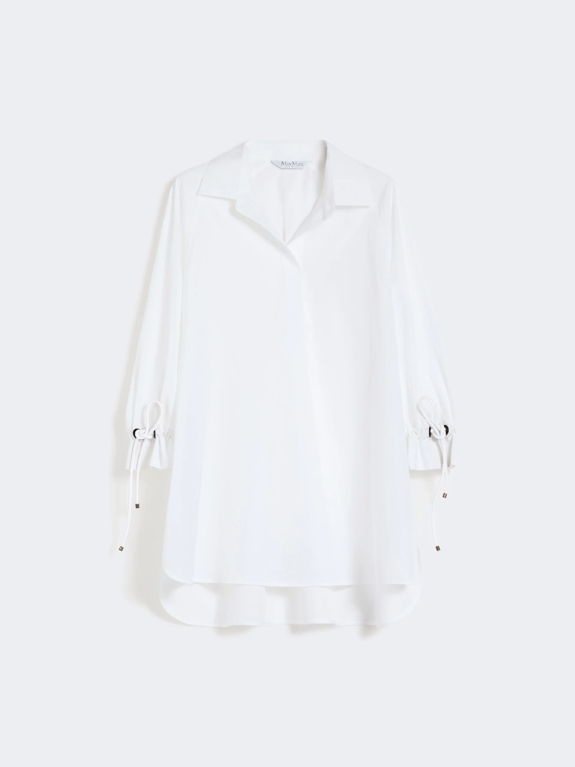 DETAILS Oversized blouse with shirt-style design, featuring tubular leather drawstrings at the cuffs with horn eyelets and metal ends. - Pure cotton poplin blouse - Wide lines - Open polo collar on the front and raglan sleeves - Rounded hem with side slits, longer at the back - Unlined COMPOSITION AND CARE Fabric 100% cotton; - exclusive of decoration. Hand wash cold (40°c max); do not bleach; do not tumble dry; line drying in the shade; cool iron; professionally dry clean perchloroethylene - mild process; do not wet clean.; put this item into a string bag before washing it.; do not iron the real leather details.; protect the ends stoppers and/or the cord ends before washing.; turn the articles inside out before washing.; contains non-textile parts of animal origin. Distributed by Max Mara S.r.l., registered office in Reggio Emilia (Italy), Via Giulia Maramotti 4, 42124 (IT) Collection: Max Mara Product code: 1191066206001 - MXMADORNI