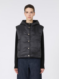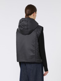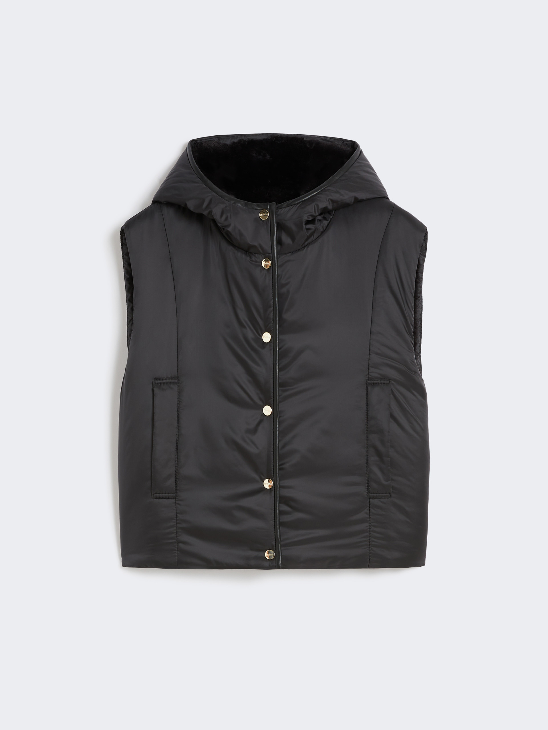 DETAILS Reversible short hooded gilet. The Cameluxe padding sets the garment apart Water-repellent canvas gilet Cropped waist cut Front zip fastening on one side and button fastening on the other In-seam side pockets COMPOSITION AND CARE Fabric 100% polyester; inner fabric 100% polyester; with quilting in 48% polyester, 48% camelwool, 4% silk. Do not wash; do not bleach; do not tumble dry; do not iron; professionally dry clean perchloroethylene - mild process; do not wet clean.; wash the garment while it is fastened.; turn the articles inside out before washing. Distributed by Max Mara S.r.l., registered office in Reggio Emilia (Italy), Via Giulia Maramotti 4, 42124 (IT)