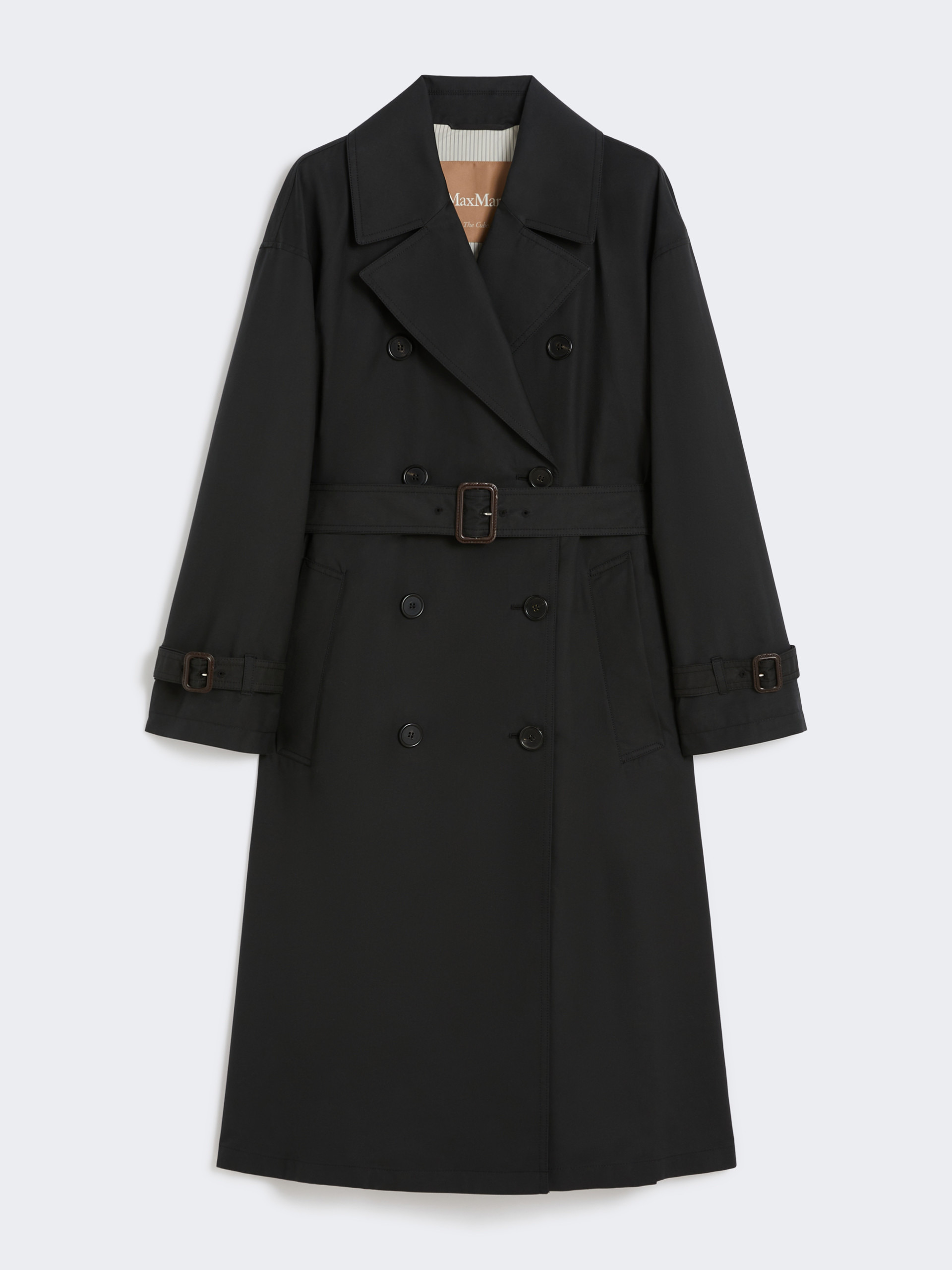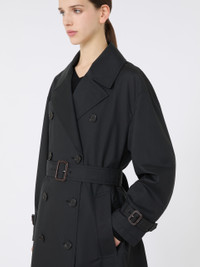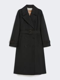 DETAILS Long trench coat with matching belt and iconic cuff straps. The main fabric contains at least 50% cotton fibre, grown according to organic farming standards Water-repellent cotton twill trench coat Large lapel collar with embossed logo on the back Long sleeves Double-breasted fastening with horn buttons Side welt pockets and deep central slit on the back Partially lined COMPOSITION AND CARE Fabric 69% cotton, 31% polyester; lining 100% polyester. Machine wash cold delicate cycle; do not bleach; do not tumble dry; line drying in the shade; cool iron; professionally dry clean perchloroethylene - mild process.; wash the garment while it is fastened.; don’t iron the labels.; do not iron the buttons.; protect buttons before washing.; turn the articles inside out before washing.; remove the buckle before washing.; contains non-textile parts of animal origin. Distributed by Max Mara S.r.l., registered office in Reggio Emilia (Italy), Via Giulia Maramotti 4, 42124 (IT)