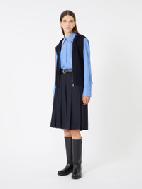 DETAILS Midi skirt crafted from wool, featuring a tailored silhouette enriched with structured pleats and concealed side slits. A clean-lined design makes this garment highly versatile. Stretch wool twill skirt Midi-length, slightly flared fit Side zip fastening In-seam side pockets Waistband with belt loops and matching coated fabric belt Unlined model COMPOSITION AND CARE Skirt fabric 97% virgin wool, 3% elastane; with belt in polyester with polyurethane coating. Skirt: do not wash; do not bleach; do not tumble dry; cool iron; professionally dry clean perchloroethylene - mild process; do not wet clean. Belt: do not wash; do not bleach; do not tumble dry; do not iron; do not dry clean; do not wet clean. Distributed by Max Mara S.r.l., registered office in Reggio Emilia (Italy), Via Giulia Maramotti 4, 42124 (IT)
