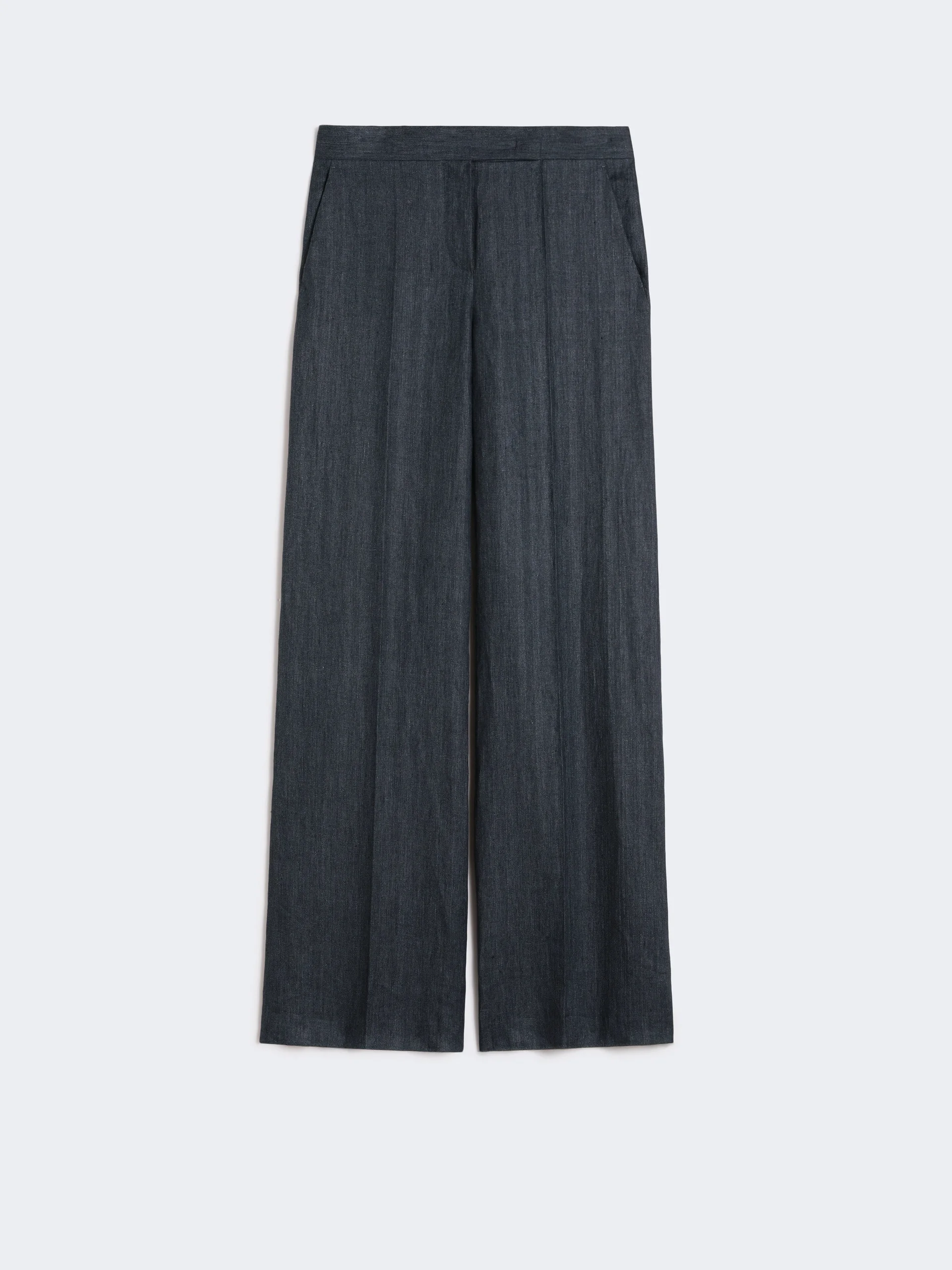 DETAILS Mannish-inspired long trousers featuring a herringbone pattern. - Mottled pure linen twill trousers - Wide leg - High-cut waistband with a fly-covered zip and hook-and-bar fastening - Slant side pockets - Pressed pleat detail and sewn darts on the back of the waist COMPOSITION AND CARE 100% flaxlinen. Do not wash; do not bleach; do not tumble dry; cool iron; professionally dry clean perchloroethylene - mild process; do not wet clean.; protect buttons before washing. Distributed by Max Mara S.r.l., registered office in Reggio Emilia (Italy), Via Giulia Maramotti 4, 42124 (IT) Collection: Max Mara Product code: 1131016206005 - MXMDESERTO