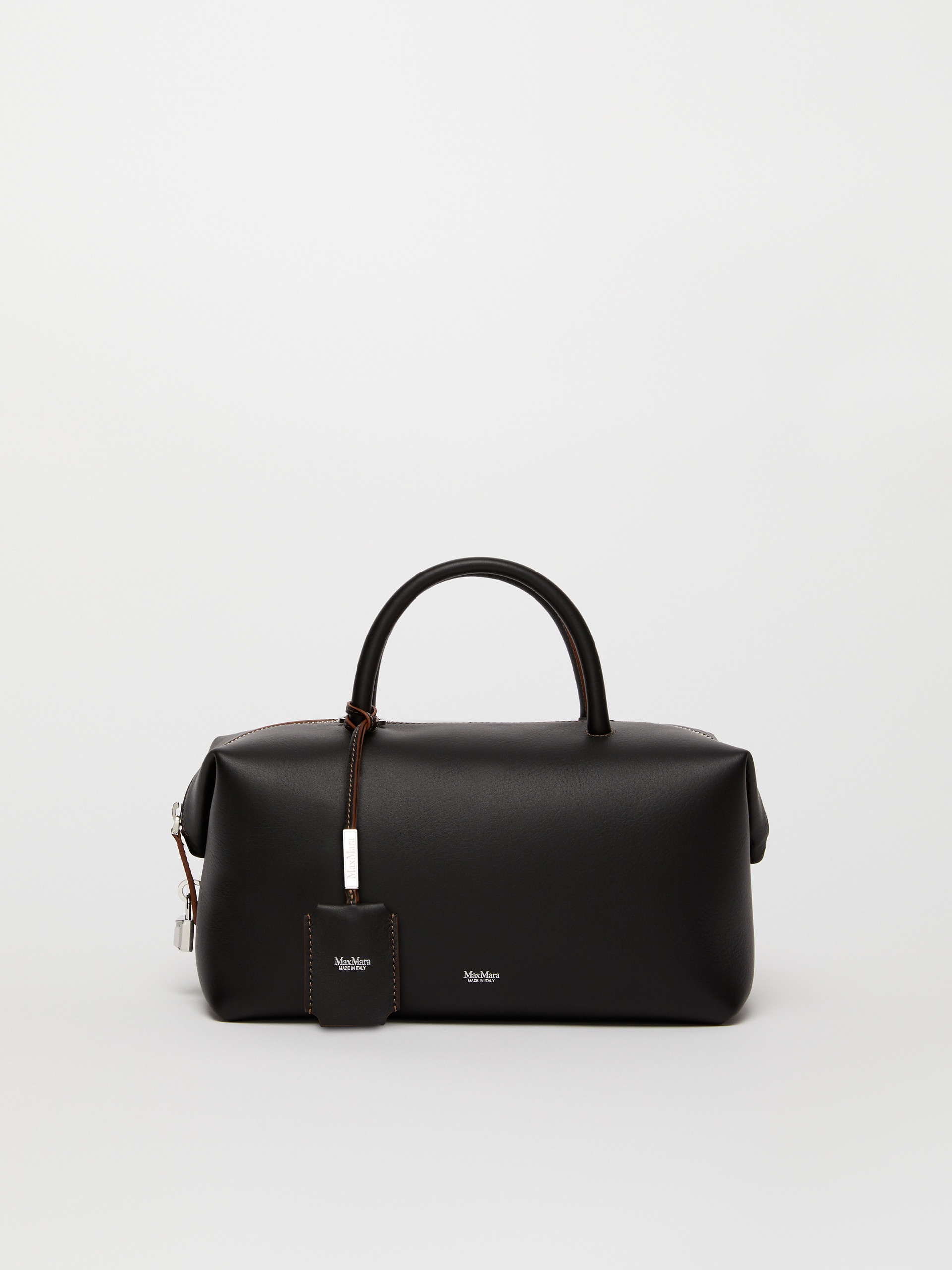 DETAILS Handbag with two handles and slightly folded sides. Complete with removable shoulder strap for crossbody wear, custom key tag, leather feet and metal Max Mara lettering on the front. Natural calfskin bag Suede interior with flat M-shaped inner pocket Zip fastening at the top and branded padlock on one side Size: 26 x 15 x 13 cm COMPOSITION AND CARE Handbag in calf; inside in goat leather. Distributed by Max Mara S.r.l., registered office in Reggio Emilia (Italy), Via Giulia Maramotti 4, 42124 (IT)