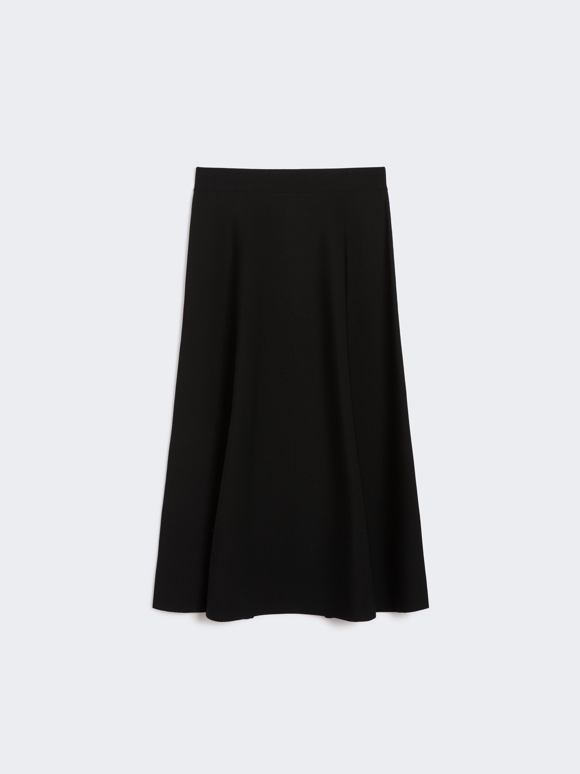 DETAILS Below-the-knee midi skirt with a slightly flared line. The main fabric of this garment contains raw materials derived from wood cellulose, a fibre produced with respect for the forest Viscose crepe yarn skirt Ribbed elasticated waistband Wave pattern on the hem Unlined COMPOSITION AND CARE 65% viscose, 35% polyamide. Hand wash cold (40°c max); do not bleach; do not tumble dry; flat drying in the shade; cool iron; professionally dry clean perchloroethylene - mild process; do not wet clean.; iron with a cloth between.; using neutral detergent. Distributed by Max Mara S.r.l., registered office in Reggio Emilia (Italy), Via Giulia Maramotti 4, 42124 (IT)