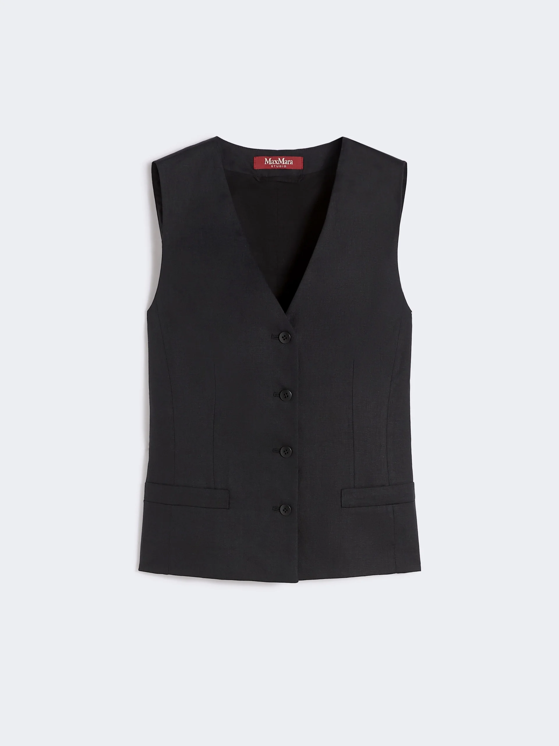 DETAILS Fitted-waist gilet with a fit-adjusting back strap. - Gilet in washed and lightweight pure linen canvas - Regular fit - V-neck - Single-breasted visible 4-button fastening - Welt side pockets - Lined model COMPOSITION AND CARE Fabric 100% flaxlinen; lining 1 100% cotton; lining 2 100% flaxlinen. Machine wash cold delicate cycle; do not bleach; do not tumble dry; line drying in the shade; cool iron; professionally dry clean perchloroethylene - mild process.; wash the garment while it is fastened.; do not iron the buttons.; protect buttons before washing.; turn the articles inside out before washing. Distributed by Max Mara S.r.l., registered office in Reggio Emilia (Italy), Via Giulia Maramotti 4, 42124 (IT) Collection: Studio Product code: 6151016206035 - MSTCARNET
