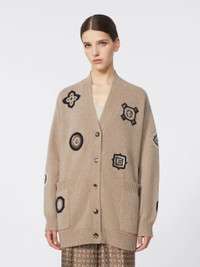 DETAILS Stockinette-stitched long cardigan embellished with thread, sequin and rhinestone-embroidered detail. - Wool and cashmere yarn cardigan - Oversized fit - V-neck and long low set-in sleeves - Front fastening with horn buttons - Patch pockets at the bottom - Ribbed cuffs and hem COMPOSITION AND CARE Knitted fabric 70% wool, 30% cashmere; - exclusive of decoration. Hand wash cold (40°c max); do not bleach; do not tumble dry; flat drying in the shade; cool iron; do not dry clean; do not wet clean.; iron with a cloth between.; using neutral detergent. Distributed by Max Mara S.r.l., registered office in Reggio Emilia (Italy), Via Giulia Maramotti 4, 42124 (IT) Collection: Max Mara Product code: 1341026106031 - MXMGIOIRE