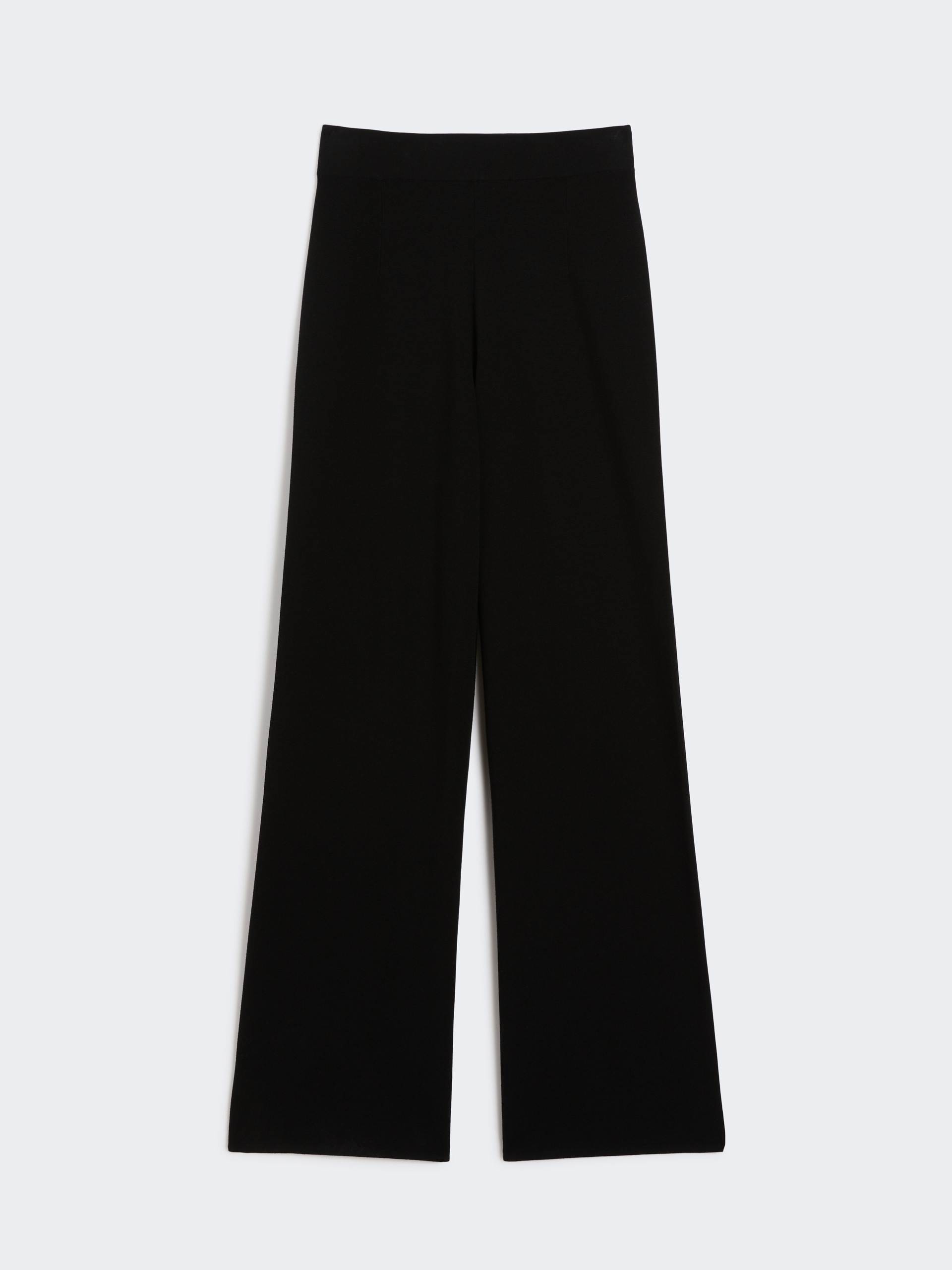 DETAILS Long trousers featuring a straight cut that flares slightly at the hem. Linen-knit stretch viscose yarn trousers Relaxed fit Elasticated waistband COMPOSITION AND CARE 72% viscose, 28% polyester. Hand wash cold; do not bleach; do not tumble dry; flat drying in the shade; cool iron; professionally dry clean perchloroethylene - mild process; do not wet clean.; iron with a cloth between.; using neutral detergent. Distributed by Max Mara S.r.l., registered office in Reggio Emilia (Italy), Via Giulia Maramotti 4, 42124 (IT)
