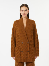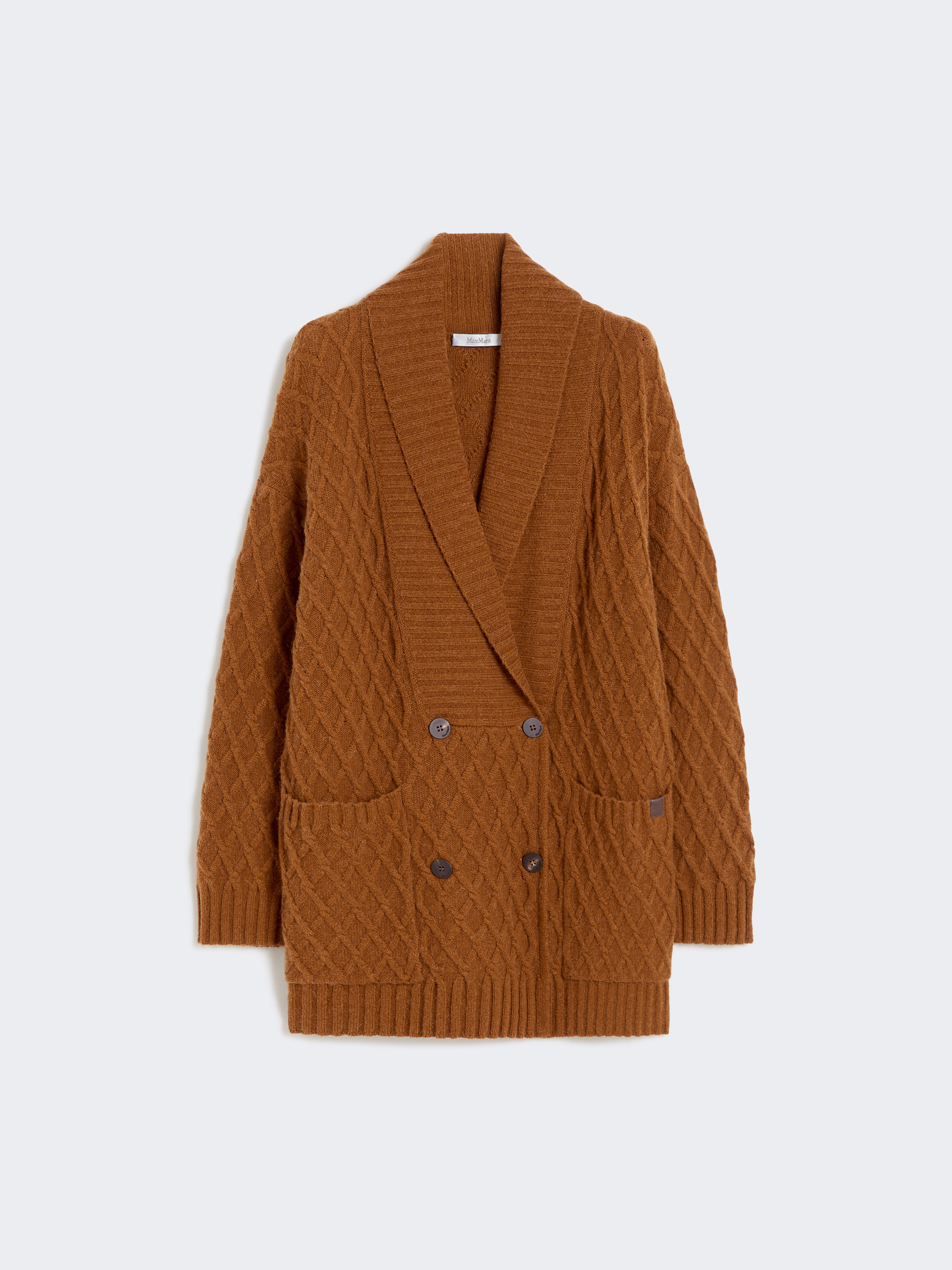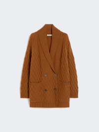 DETAILS Double-breasted cardigan in an all-over cable-pattern knit. Pure camel yarn cardigan Comfortable fit and straight lines Wide, ribbed shawl collar Long sleeves with dropped shoulders Front fastening with horn buttons Patch pockets Leather logo label on the right pocket COMPOSITION AND CARE 100% camelwool. Hand wash cold (40°c max); do not bleach; do not tumble dry; flat drying in the shade; cool iron; professionally dry clean perchloroethylene - mild process; do not wet clean.; iron with a cloth between.; using neutral detergent. Distributed by Max Mara S.r.l., registered office in Reggio Emilia (Italy), Via Giulia Maramotti 4, 42124 (IT)