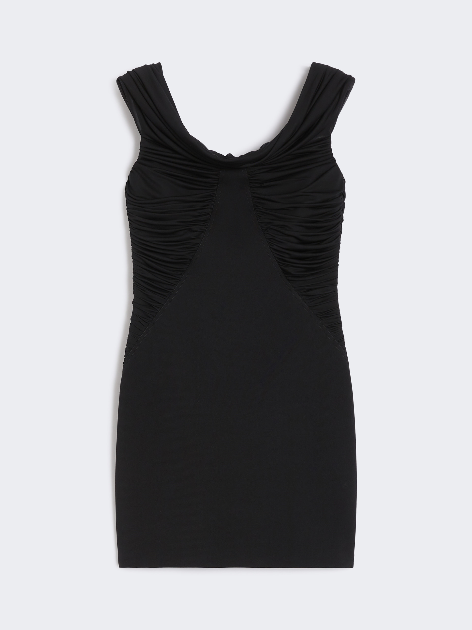 DETAILS Short sleeveless dress, finished with layered tulle inserts that create a gathered motif on the neckline and sides. The main fabric of this garment contains raw materials derived from wood cellulose, a fibre produced with respect for the forest Dress in viscose jersey knitted in a fabric stitch Figure-hugging Straight neckline with gathered off-the-shoulder design Concealed zip fastening at the side Unlined COMPOSITION AND CARE Jersey fabric 1 68% viscose, 28% polyamide, 4% elastane; jersey fabric 2 100% viscose. Do not wash; do not bleach; do not tumble dry; cool iron; professionally dry clean perchloroethylene - mild process; do not wet clean.; iron with a cloth between.; put this item into a string bag before washing it. Distributed by Max Mara S.r.l., registered office in Reggio Emilia (Italy), Via Giulia Maramotti 4, 42124 (IT)