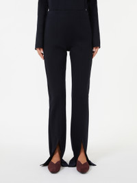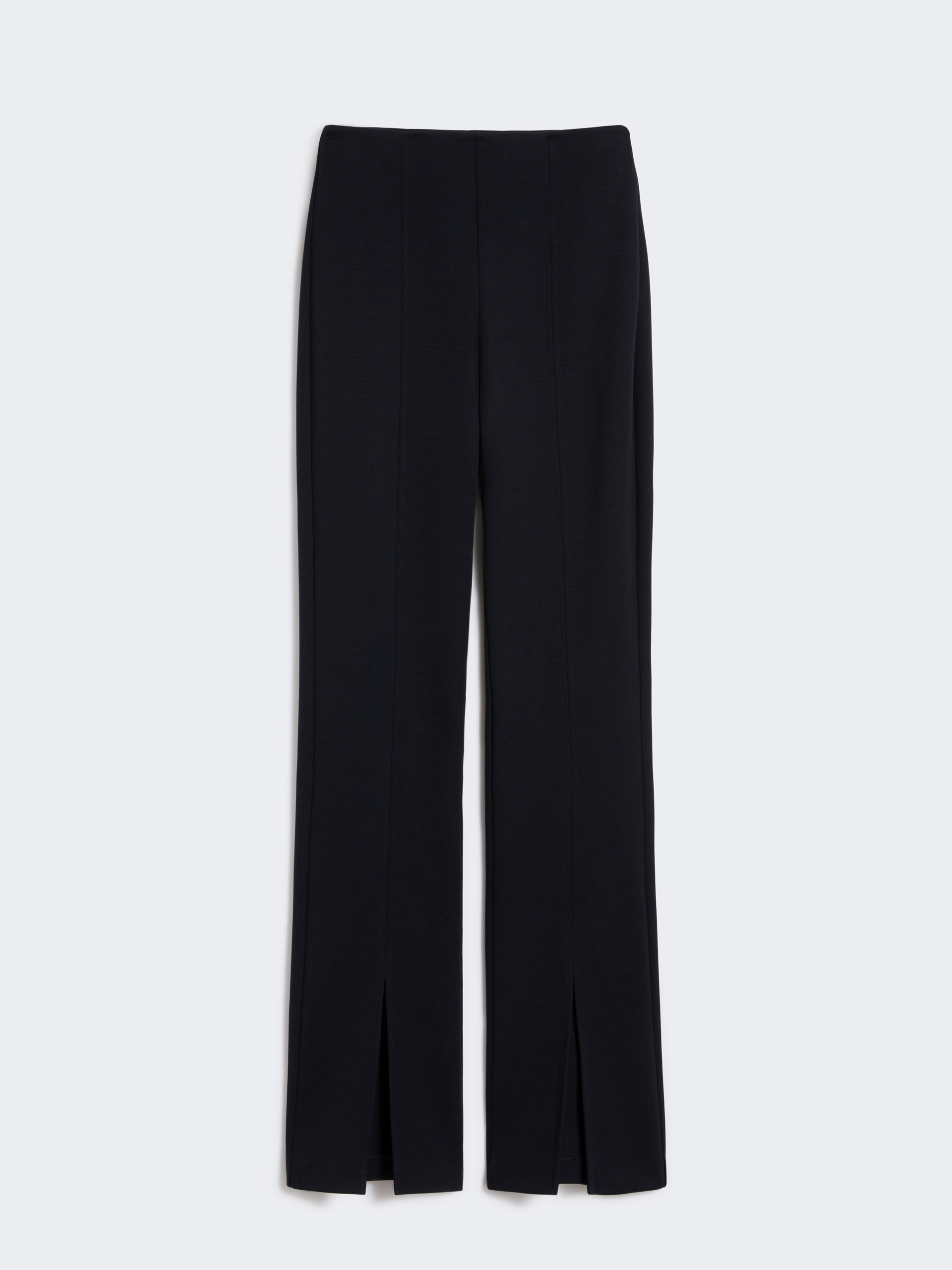 DETAILS Long trousers featuring a stitching motif at the centre front and deep slits at the hem. Cotton and wool jersey and gabardine trousers Straight cut Side closure with concealed zip. Welt pockets at the back Back waist darts Internal logo ribbon trim COMPOSITION AND CARE 62% virgin wool, 33% cotton, 5% elastane. Hand wash cold (40°c max); do not bleach; do not tumble dry; flat drying in the shade; cool iron; professionally dry clean perchloroethylene - mild process; do not wet clean.; iron with a cloth between.; using neutral detergent.; don’t rub.; turn the articles inside out before washing.; to be ironed on reverse. Distributed by Max Mara S.r.l., registered office in Reggio Emilia (Italy), Via Giulia Maramotti 4, 42124 (IT)