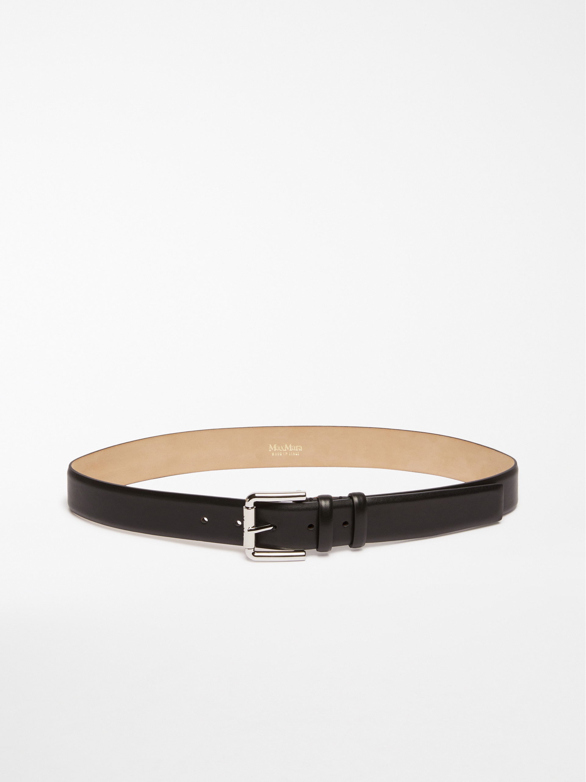 DETAILS Classic mannish belt with two loops and contoured tip. Natural calfskin belt Glossy finish Metal prong buckle fastening Width: 3.5 cm The accessory comes in a Max Mara branded fabric dust bag COMPOSITION AND CARE Material belt calf; back cattle. Distributed by Max Mara S.r.l., registered office in Reggio Emilia (Italy), Via Giulia Maramotti 4, 42124 (IT)