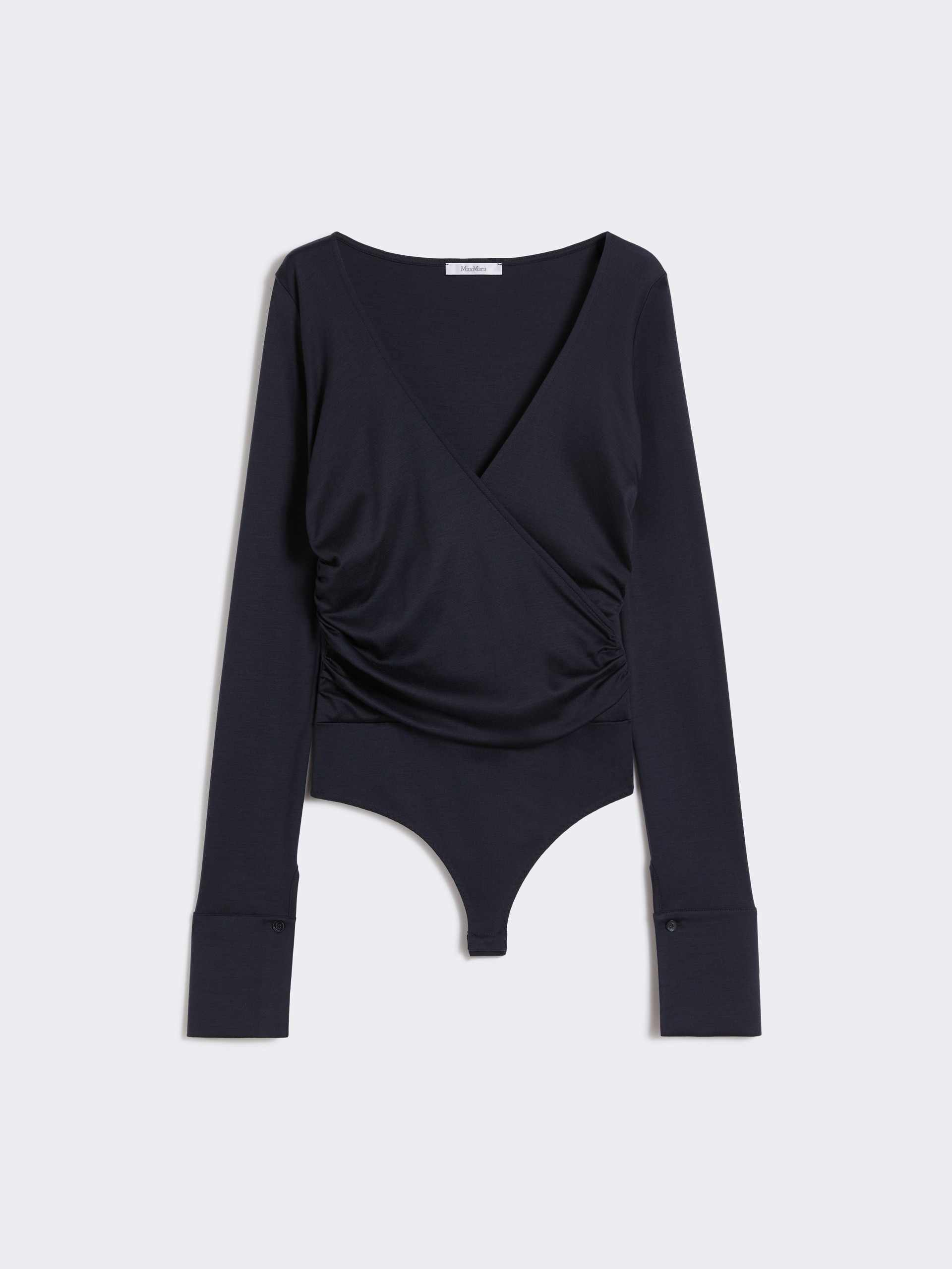 DETAILS Slim-fit bodysuit with draped motif on the sides and gathered sleeves, creating a wavy effect that gives movement to the garment. Pure wool jersey bodysuit Figure-hugging Crossed V neck Long sleeves with deep, shirt-style cuffs Snap-button fastening on the bottom COMPOSITION AND CARE 100% wool. Hand wash cold (40°c max); do not bleach; do not tumble dry; drip line drying in the shade; cool iron; professionally dry clean perchloroethylene - mild process; do not wet clean.; iron with a cloth between.; using neutral detergent. Distributed by Max Mara S.r.l., registered office in Reggio Emilia (Italy), Via Giulia Maramotti 4, 42124 (IT)