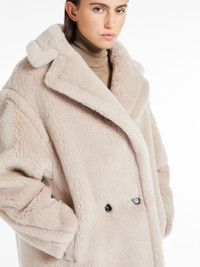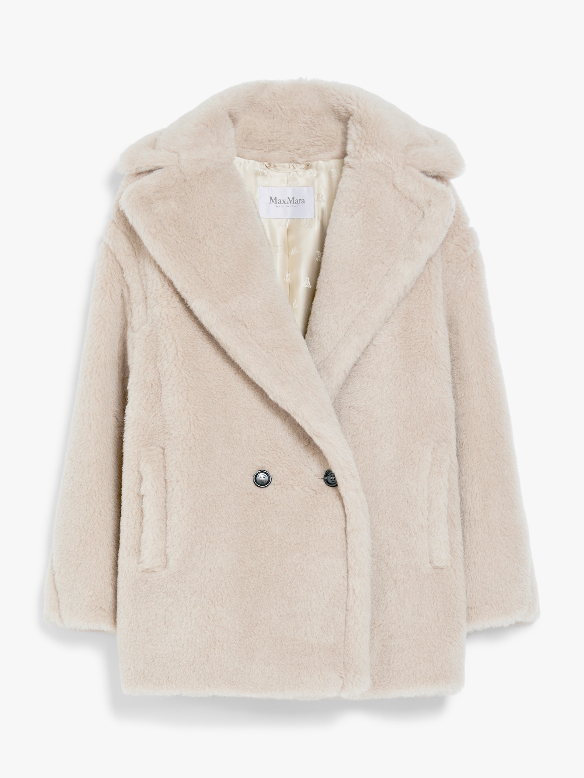 DETAILS Iconic Teddy Bear coat in a short mid-thigh version. - Coat made of alpaca and wool Teddy fabric on a silk base - Oversized volume - Wide lapel collar - Long sleeves with dropped shoulders - Double-breasted closure with two visible buttons - Welt pockets on the sides - Lined COMPOSITION AND CARE Jersey fabric 62% alpaca, 26% virgin wool, 12% silk; lining 100% viscose. Do not wash; do not bleach; do not tumble dry; do not iron; professionally dry clean perchloroethylene - mild process; do not wet clean.; protect buttons before washing.; contains non-textile parts of animal origin. Distributed by Max Mara S.r.l., registered office in Reggio Emilia (Italy), Via Giulia Maramotti 4, 42124 (IT)