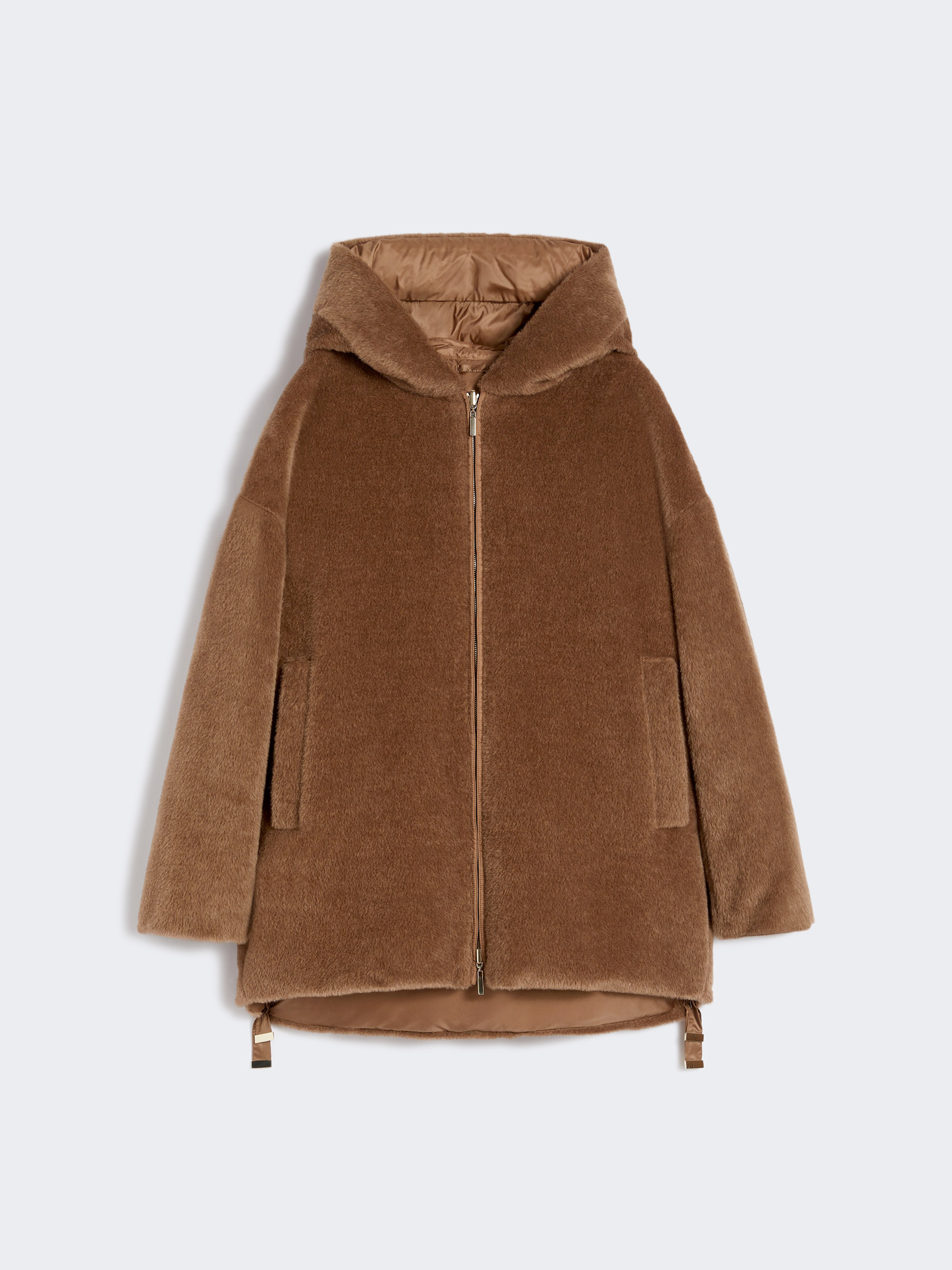 DETAILS Reversible padded jacket with a straight fit and adjustable drawstring at the hem with tapes on the sides. Jacket in alpaca and wool fabric with a faux fur effect Interior in water-repellent quilted canvas Hood with internal drawstring Long sleeves Front fastening with double slider zip Welt pockets on both sides Goose-down padding COMPOSITION AND CARE Fabric 62% alpaca, 38% virgin wool; inner fabric 100% polyester; with quilting virgin goose-down. Do not wash; do not bleach; do not tumble dry; cool iron; professionally dry clean perchloroethylene - mild process; do not wet clean.; wash the garment while it is fastened.; don’t iron the labels.; protect the ends stoppers and/or the cord ends before washing.; contains non-textile parts of animal origin. Distributed by Max Mara S.r.l., registered office in Reggio Emilia (Italy), Via Giulia Maramotti 4, 42124 (IT)