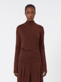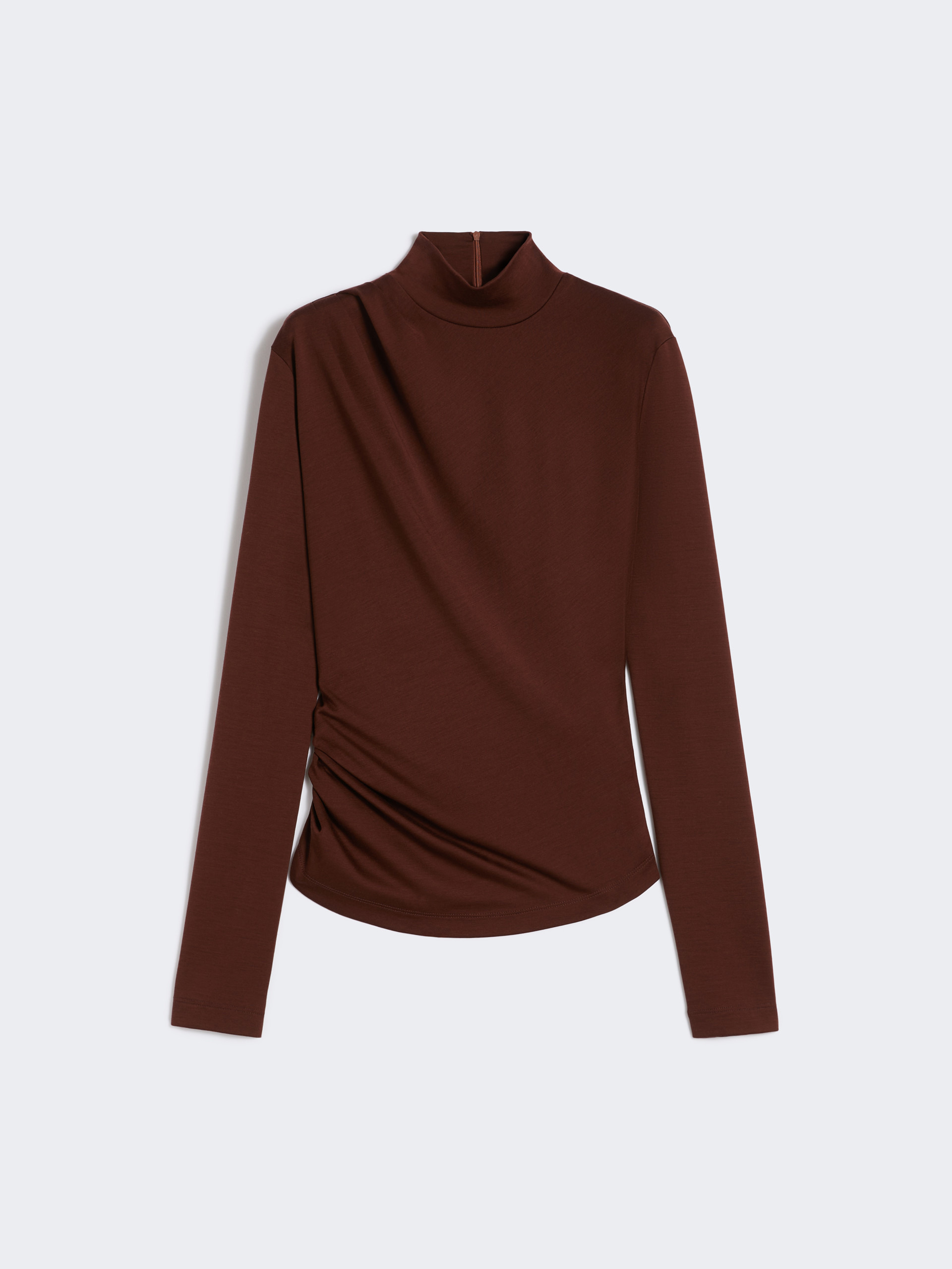 DETAILS Turtleneck top with draped pleated pattern on the shoulder and right side, giving movement to the garment. Pure wool jersey top Figure-hugging High neck Long sleeves Back concealed zip fastening COMPOSITION AND CARE 100% wool. Hand wash cold (40°c max); do not bleach; do not tumble dry; drip line drying in the shade; cool iron; professionally dry clean perchloroethylene - mild process; do not wet clean.; iron with a cloth between.; using neutral detergent.; don’t rub.; turn the articles inside out before washing.; to be ironed on reverse. Distributed by Max Mara S.r.l., registered office in Reggio Emilia (Italy), Via Giulia Maramotti 4, 42124 (IT)