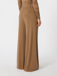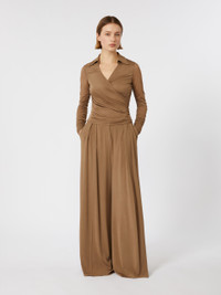 DETAILS Long tailored-style trousers with a wide-leg and double pleats at the waist on the front. The main fabric of this garment contains raw materials derived from wood cellulose, a fibre produced with respect for the forest Flowing viscose jersey trousers Fastening with high waistband tab, zip fly and small hook Slant pockets at the sides Welt pockets at the back Belt loops, one of which is double and asymmetrical COMPOSITION AND CARE 93% viscose, 7% elastane. Do not wash; do not bleach; do not tumble dry; cool iron; professionally dry clean perchloroethylene - mild process; do not wet clean.; iron with a cloth between. Distributed by Max Mara S.r.l., registered office in Reggio Emilia (Italy), Via Giulia Maramotti 4, 42124 (IT)