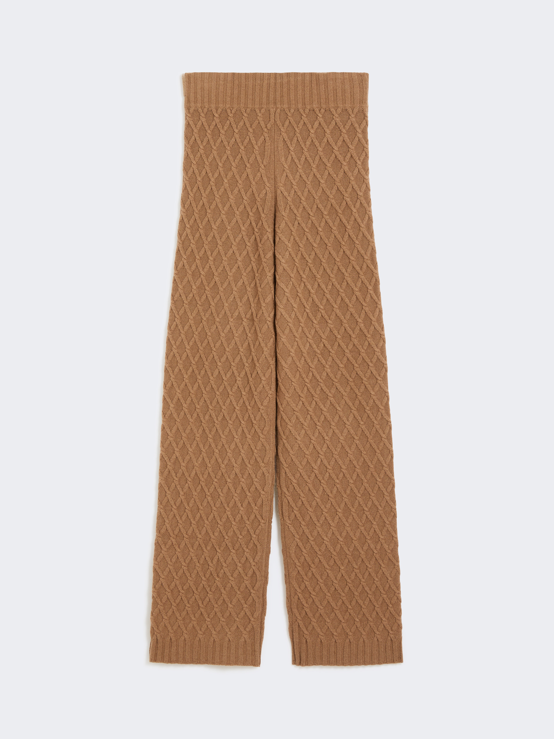 DETAILS Long trousers with a comfortable fit, in an all-over cable-pattern knit. Pure camel yarn trousers Straight cut Elasticated high waist with wide ribs Internal waistband with jacquard logo tape Finished with a ribbed trim at the hem COMPOSITION AND CARE 100% camelwool. Hand wash cold (40°c max); do not bleach; do not tumble dry; flat drying in the shade; cool iron; professionally dry clean perchloroethylene - mild process; do not wet clean.; iron with a cloth between.; using neutral detergent. Distributed by Max Mara S.r.l., registered office in Reggio Emilia (Italy), Via Giulia Maramotti 4, 42124 (IT)