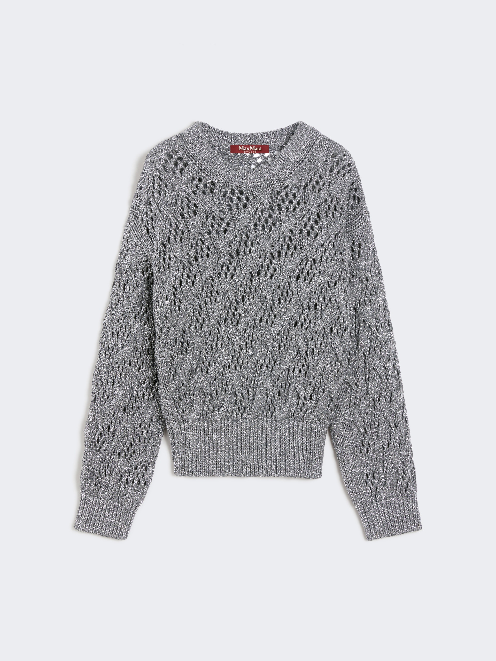 DETAILS Boxy-fit sweater featuring a slightly cropped waist cut. Lurex cordonnet sweater with an open cable-knit pattern Crew-neck Long low set-in sleeves Rib-knit trims COMPOSITION AND CARE Knitted fabric 80% viscose, 20% metallised fiber; hems 79% viscose, 19% metallised fiber, 1% polyamide, 1% elastane. Do not wash; do not bleach; do not tumble dry; cool iron; professionally dry clean perchloroethylene - mild process; do not wet clean.; iron with a cloth between. Distributed by Max Mara S.r.l., registered office in Reggio Emilia (Italy), Via Giulia Maramotti 4, 42124 (IT)