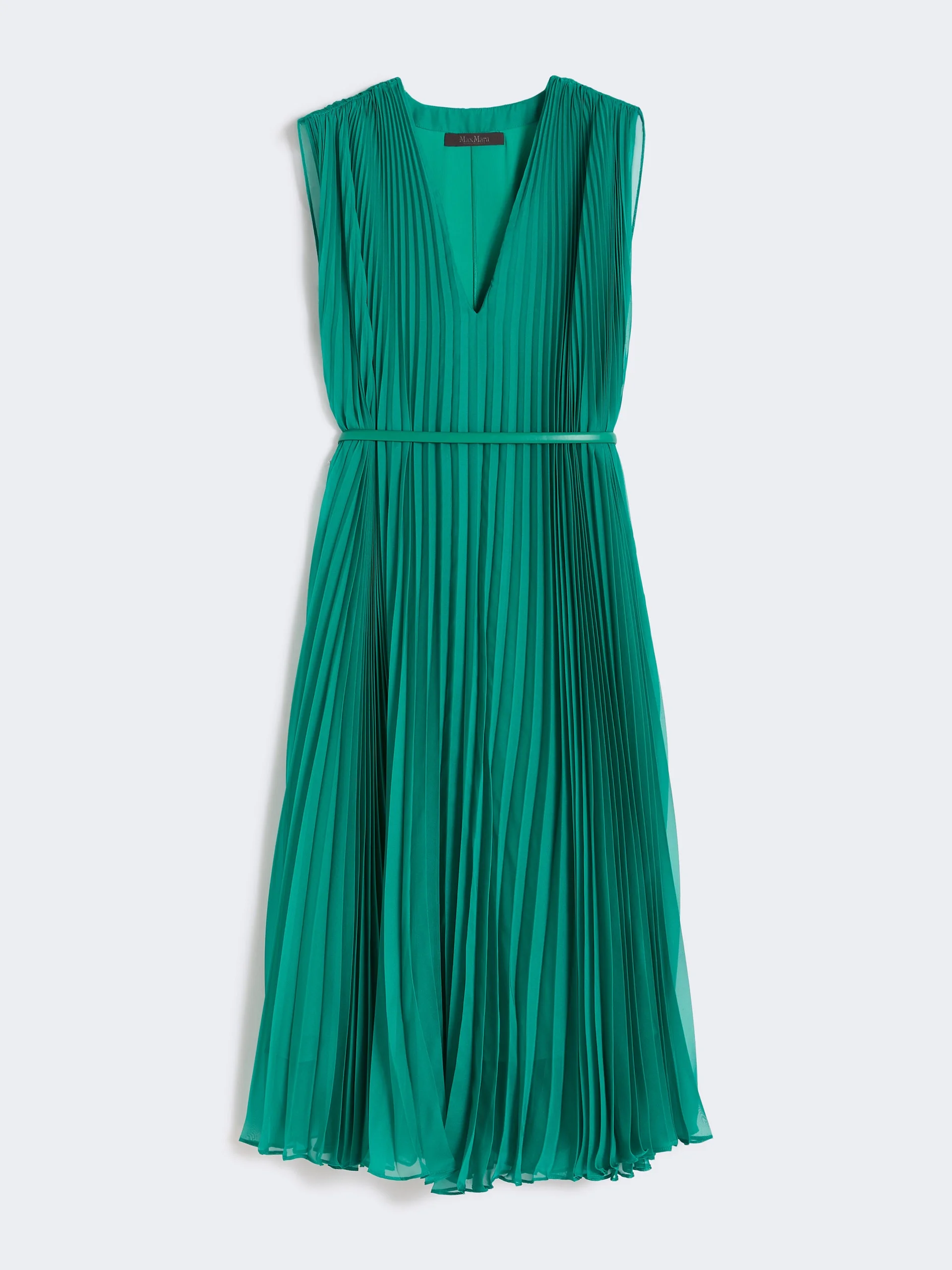 DETAILS Sleeveless midi dress with matching belt to wear at the waist to accentuate the silhouette or inserted only on the front to create a cape effect on the back. - Plisse-pleated chiffon dress - Wide, flared fit - Polo collar with concealed fastening, top M Monogram visible - Lined model COMPOSITION AND CARE Dress fabric 100% polyester; lining 85% acetate, 10% silk, 5% polyamide; with belt in cattle. Dress: do not wash; do not bleach; do not tumble dry; cool iron; professionally dry clean perchloroethylene - mild process; do not wet clean. Belt: do not wash; do not bleach; do not tumble dry; do not iron; do not dry clean; do not wet clean. Distributed by Max Mara S.r.l., registered office in Reggio Emilia (Italy), Via Giulia Maramotti 4, 42124 (IT) Collection: Max Mara Product code: 1221026406004 - MXECAPSULA