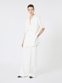 DETAILS Short-sleeved blouse featuring a plain knit on the front and a pleated-effect texture on the back. The main fabric of this garment contains raw materials derived from wood cellulose, a fibre produced with respect for the forest Viscose crepe yarn blouse Straight cut Open polo collar Open V-neck with tubular drawstring and metal ends Side slits COMPOSITION AND CARE 65% viscose, 35% polyamide. Hand wash cold (40°c max); do not bleach; do not tumble dry; flat drying in the shade; cool iron; professionally dry clean perchloroethylene - mild process; do not wet clean.; iron with a cloth between.; using neutral detergent. Distributed by Max Mara S.r.l., registered office in Reggio Emilia (Italy), Via Giulia Maramotti 4, 42124 (IT)