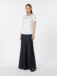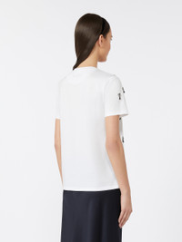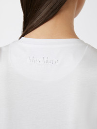 DETAILS Couture T-shirt with luxurious collection embroidery on the front. Soft, mercerised pure cotton jersey T-shirt Straight cut Crew neck Short set-in sleeves Max Mara Studio logo embroidered in thread and rhinestones on the back of the neck COMPOSITION AND CARE Jersey fabric 100% cotton; fabric 100% polyester; - exclusive of decoration. Hand wash cold (40°c max); do not bleach; do not tumble dry; flat drying in the shade; cool iron; do not dry clean; do not wet clean.; iron with a cloth between.; using neutral detergent.; don’t rub.; turn the articles inside out before washing.; to be ironed on reverse.; do not iron the decoration. Distributed by Max Mara S.r.l., registered office in Reggio Emilia (Italy), Via Giulia Maramotti 4, 42124 (IT)