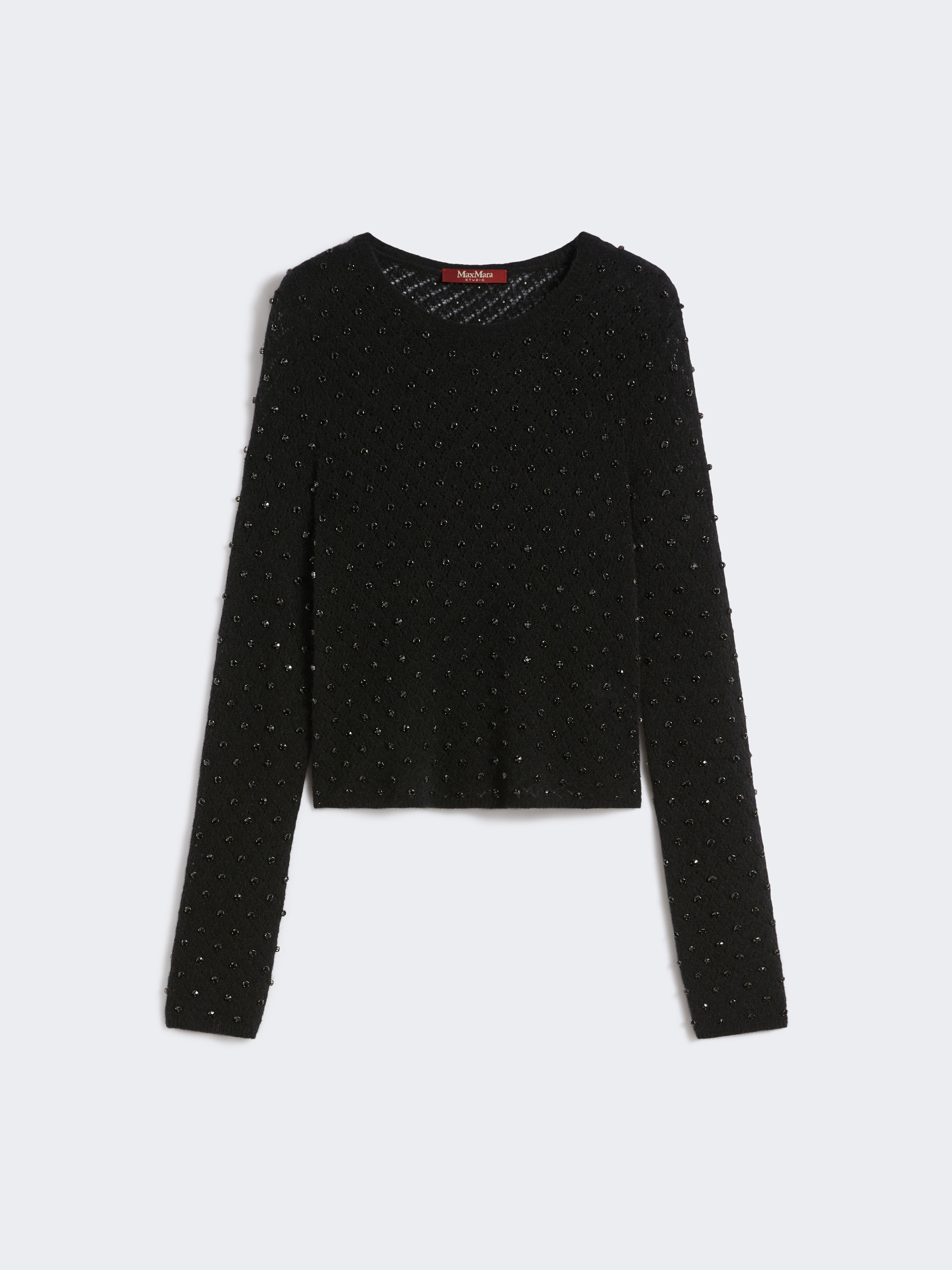 DETAILS Sweater crafted from a blended yarn enriched with all-over bejewelled chaton-embroidered detail, adding sophisticated accents and enhancing the silhouette. The plush texture ensures comfort. Wool and mohair-blend yarn sweater Slim fit Crew neckline Long sleeves Straight hem COMPOSITION AND CARE Knitted fabric 33% polyamide, 32% mohair, 32% wool, 3% elastane; - exclusive of decoration. Hand wash cold (40°c max); do not bleach; do not tumble dry; flat drying in the shade; cool iron; do not dry clean; do not wet clean.; iron with a cloth between.; using neutral detergent.; don’t rub.; squeeze without wringing. Distributed by Max Mara S.r.l., registered office in Reggio Emilia (Italy), Via Giulia Maramotti 4, 42124 (IT)