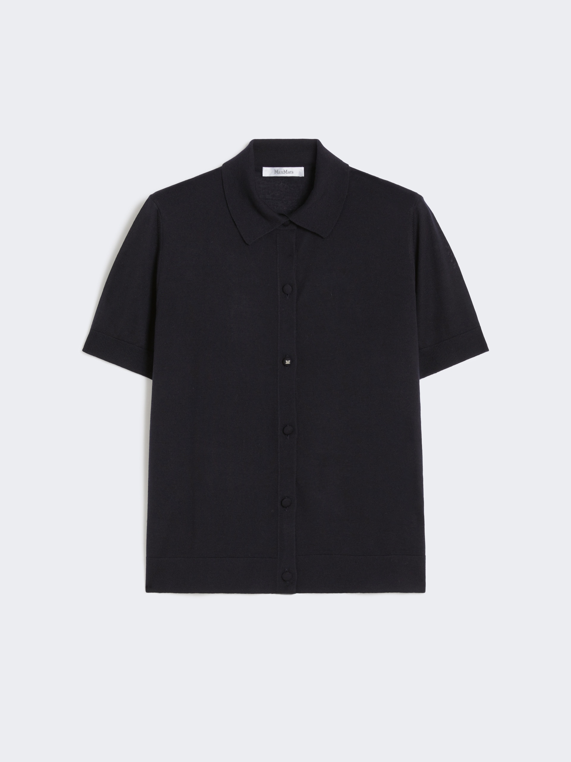 DETAILS Short-sleeved cardigan with a slim fit. Fine, pure wool yarn cardigan Straight cut Shirt collar Front fastening with knitted-cover buttons Small, squared side slits COMPOSITION AND CARE 100% virgin wool. Hand wash cold (40°c max); do not bleach; do not tumble dry; flat drying in the shade; cool iron; professionally dry clean perchloroethylene - mild process; do not wet clean.; iron with a cloth between.; using neutral detergent.; protect accessories before washing. Distributed by Max Mara S.r.l., registered office in Reggio Emilia (Italy), Via Giulia Maramotti 4, 42124 (IT)