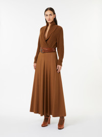 DETAILS Long, high-waisted skirt featuring vertical seams and semi-sewn pleats that add volume and movement to the garment. Skirt in lightweight pure camel zibeline drap Flared Back concealed zip fastening Lined in stretch fabric COMPOSITION AND CARE Fabric 100% camelwool; lining 95% acetate, 5% elastane. Do not wash; do not bleach; do not tumble dry; cool iron; professionally dry clean perchloroethylene - mild process; do not wet clean. Distributed by Max Mara S.r.l., registered office in Reggio Emilia (Italy), Via Giulia Maramotti 4, 42124 (IT)