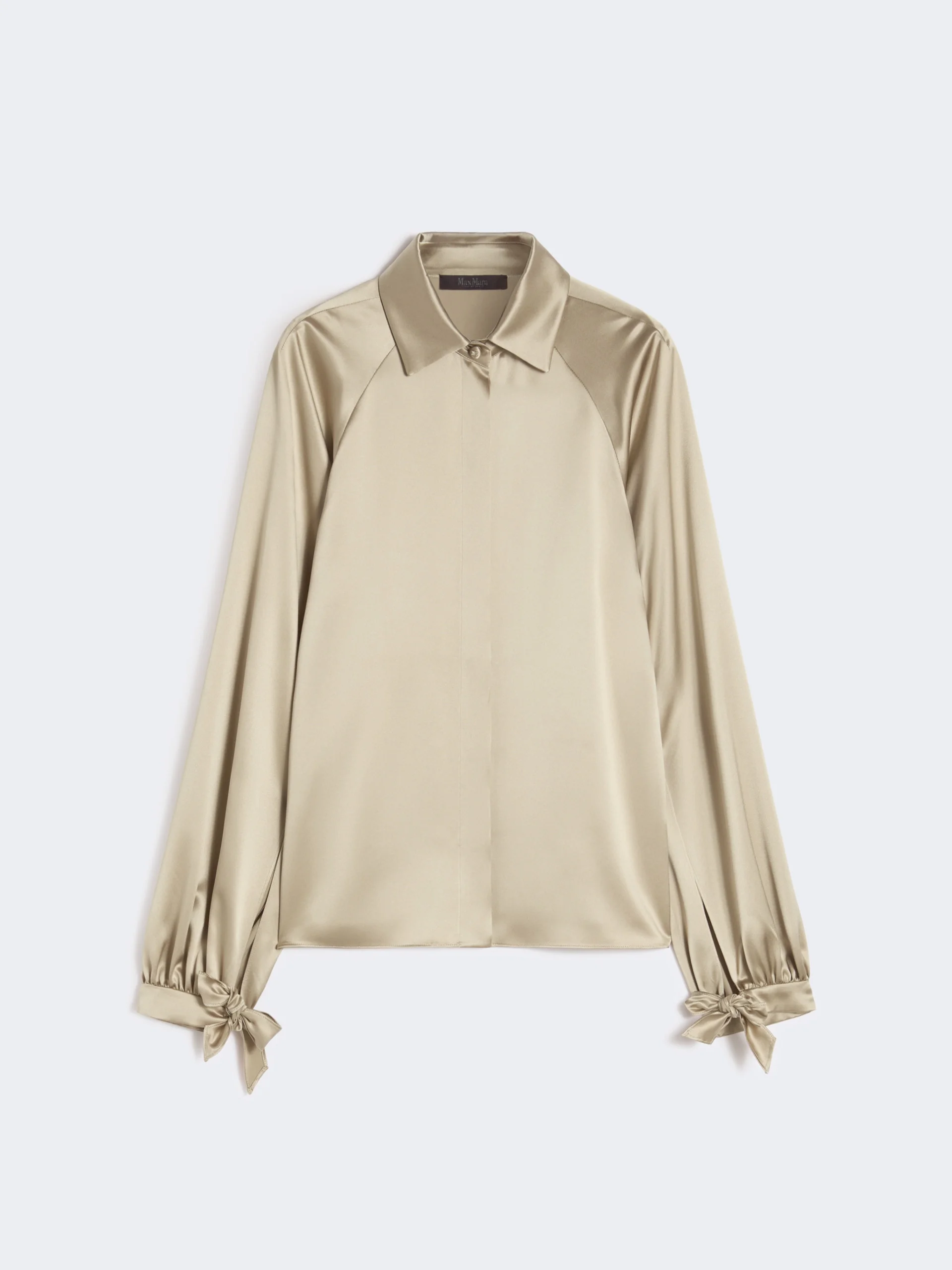 DETAILS Feminine shirt featuring raglan sleeves with open slit detail on the inward-facing side and fabric tie-fastening cuffs. - Shirt in heavy pure silk satin fabric - Straight, fluid fit - Shirt collar - Concealed front closure with visible M Monogram top button - Straight hem COMPOSITION AND CARE 100% silk. Do not wash; do not bleach; do not tumble dry; cool iron; professionally dry clean perchloroethylene - mild process; do not wet clean. Distributed by Max Mara S.r.l., registered office in Reggio Emilia (Italy), Via Giulia Maramotti 4, 42124 (IT) Collection: Max Mara Product code: 1111016406003 - MXEALARE