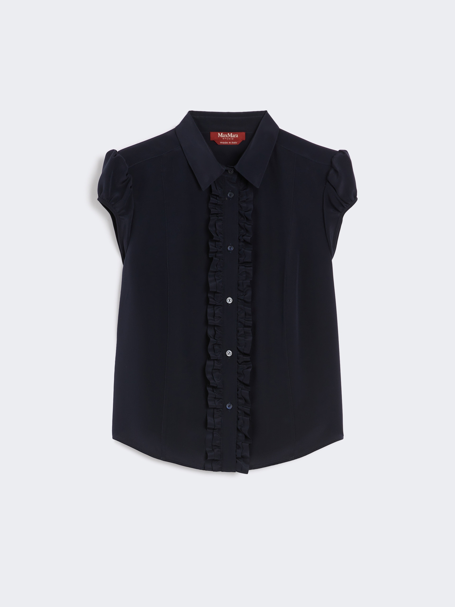 DETAILS Feminine-fit shirt featuring '40s-style details. Shirt in washed pure silk crepe de chine fabric Slim fit Classic pointed collar Puff cap sleeves Front button fastening Shirt-front detail with small ruches Rounded hem COMPOSITION AND CARE 100% silk. Hand wash cold (40°c max); do not bleach; do not tumble dry; line drying in the shade; cool iron; professionally dry clean perchloroethylene - mild process; do not wet clean.; wash the garment while it is fastened.; turn the articles inside out before washing.; contains non-textile parts of animal origin. Distributed by Max Mara S.r.l., registered office in Reggio Emilia (Italy), Via Giulia Maramotti 4, 42124 (IT)