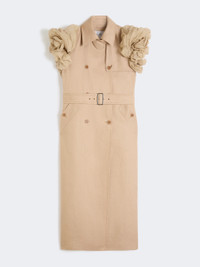 Sleeveless duster coat in linen basketweave with ruffles - CAMEL