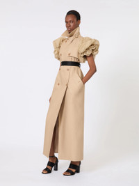 DETAILS Long sleeveless duster coat, featuring cotton organza, lurex and silk ruffles at the armholes. - Regular fit - Pure linen double basketweave duster coat - Lapel collar with throat latch - Double-breasted closure with visible buttons - Welt pockets with button on the sides - Matching belt at the waist with buckle and embroidered eyelets - Storm flap on the front left - Central reverse pleat on the back with toggle and button - Lined in stretch Monogram fabric COMPOSITION AND CARE Bust 100% flaxlinen; - except joining thread; sleeves 59% cotton, 31% metallic fiber, 10% silk; lining 65% acetate, 35% polyester. Do not wash; do not bleach; do not tumble dry; cool iron; professionally dry clean perchloroethylene - mild process; do not wet clean.; restore the curly part of the fabric using steam.; put this item into a string bag before washing it.; protect the buckle before washing.; turn the articles inside out before washing. Distributed by Max Mara S.r.l., registered office in Reggio Emilia (Italy), Via Giulia Maramotti 4, 42124 (IT) Collection: Runway Product code: 1121256306002 - MXSECRU