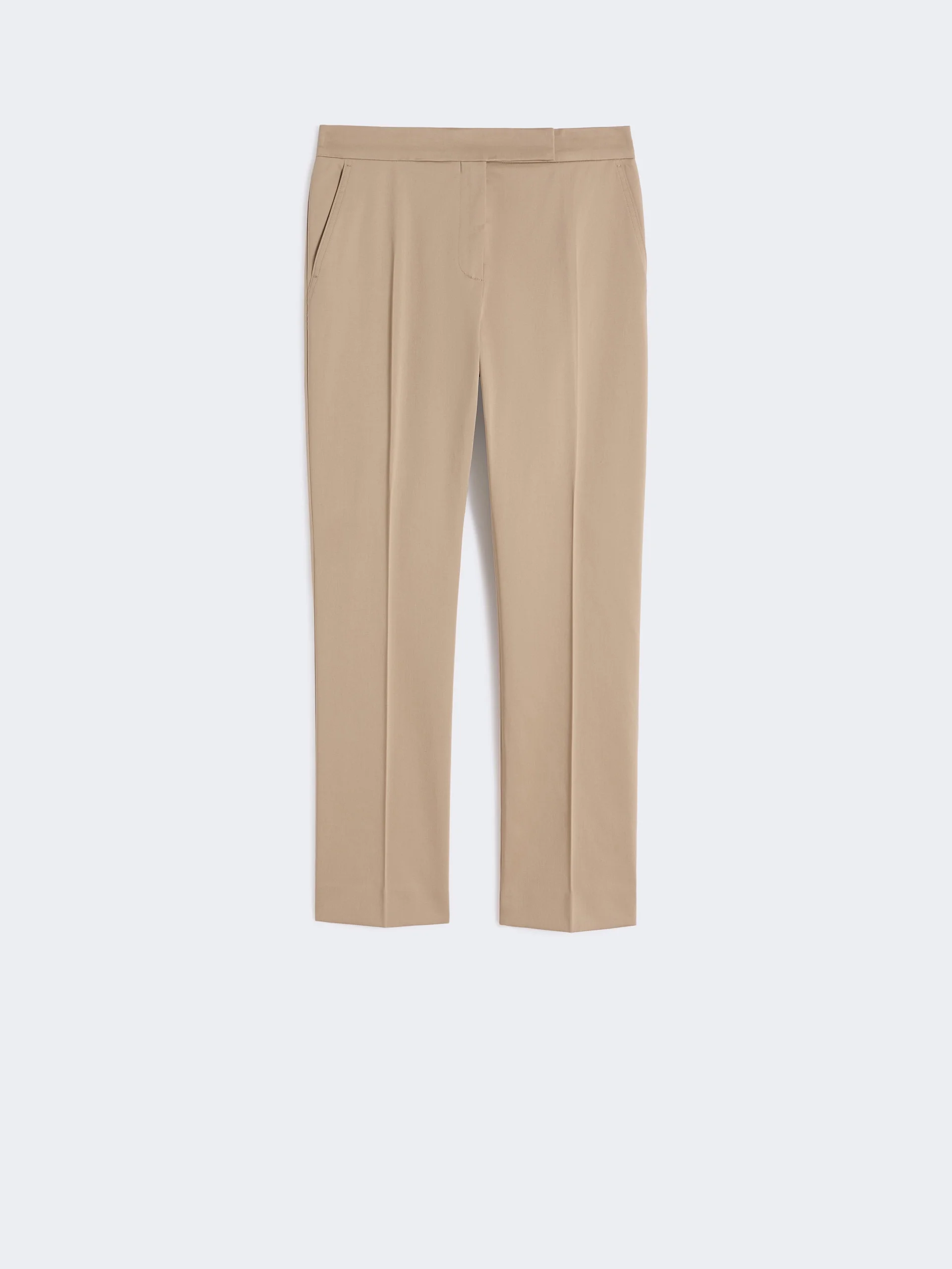DETAILS Tailored trousers with a relatively slim hem cut. - Stretch cotton satin trousers - Straight fit - High-cut waistband with a fly-covered zip and hook-and-bar fastening - Slant side pockets - Pressed pleat detail and sewn darts on the back of the waist COMPOSITION AND CARE 97% cotton, 3% elastane. Machine wash cold delicate cycle; do not bleach; do not tumble dry; line drying in the shade; cool iron; professionally dry clean perchloroethylene - mild process.; protect buttons before washing. Distributed by Max Mara S.r.l., registered office in Reggio Emilia (Italy), Via Giulia Maramotti 4, 42124 (IT) Collection: Max Mara Product code: 1131096206004 - MXMOKRA