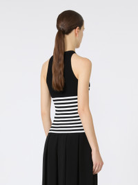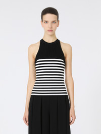 DETAILS Sleeveless top featuring a silhouette-accentuating rib-knit pattern. Stretch technical viscose yarn top Slim fit Halterneck design COMPOSITION AND CARE 83% viscose, 17% polyester. Hand wash cold (40°c max); do not bleach; do not tumble dry; flat drying in the shade; cool iron; professionally dry clean perchloroethylene - mild process; do not wet clean.; iron with a cloth between.; using neutral detergent. Distributed by Max Mara S.r.l., registered office in Reggio Emilia (Italy), Via Giulia Maramotti 4, 42124 (IT)
