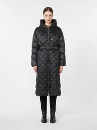 DETAILS Long down jacket featuring a straight silhouette with deep rounded side slits which can be opened with logo snap buttons. Water-repellent, nylon canvas diamond-quilted down jacket Drawstring hood Long sleeves quilted with horizontal stripes and dropped shoulders Front fastening with double slider zip Welt pockets on the sides Belt with buckle, removable with horn buttons on the back Goose-down padding COMPOSITION AND CARE Fabric 100% polyamide; lining 100% polyamide; with quilting virgin goose-down. Machine wash cold delicate cycle; do not bleach; do not tumble dry; line drying in the shade; cool iron; professionally dry clean perchloroethylene - mild process.; wash the garment while it is fastened.; wash the belt in a net sack.; do not iron the buttons.; protect buttons before washing.; protect the ends stoppers and/or the cord ends before washing.; turn the articles inside out before washing.; remove the buckle before washing.; contains non-textile parts of animal origin. Distributed by Max Mara S.r.l., registered office in Reggio Emilia (Italy), Via Giulia Maramotti 4, 42124 (IT)