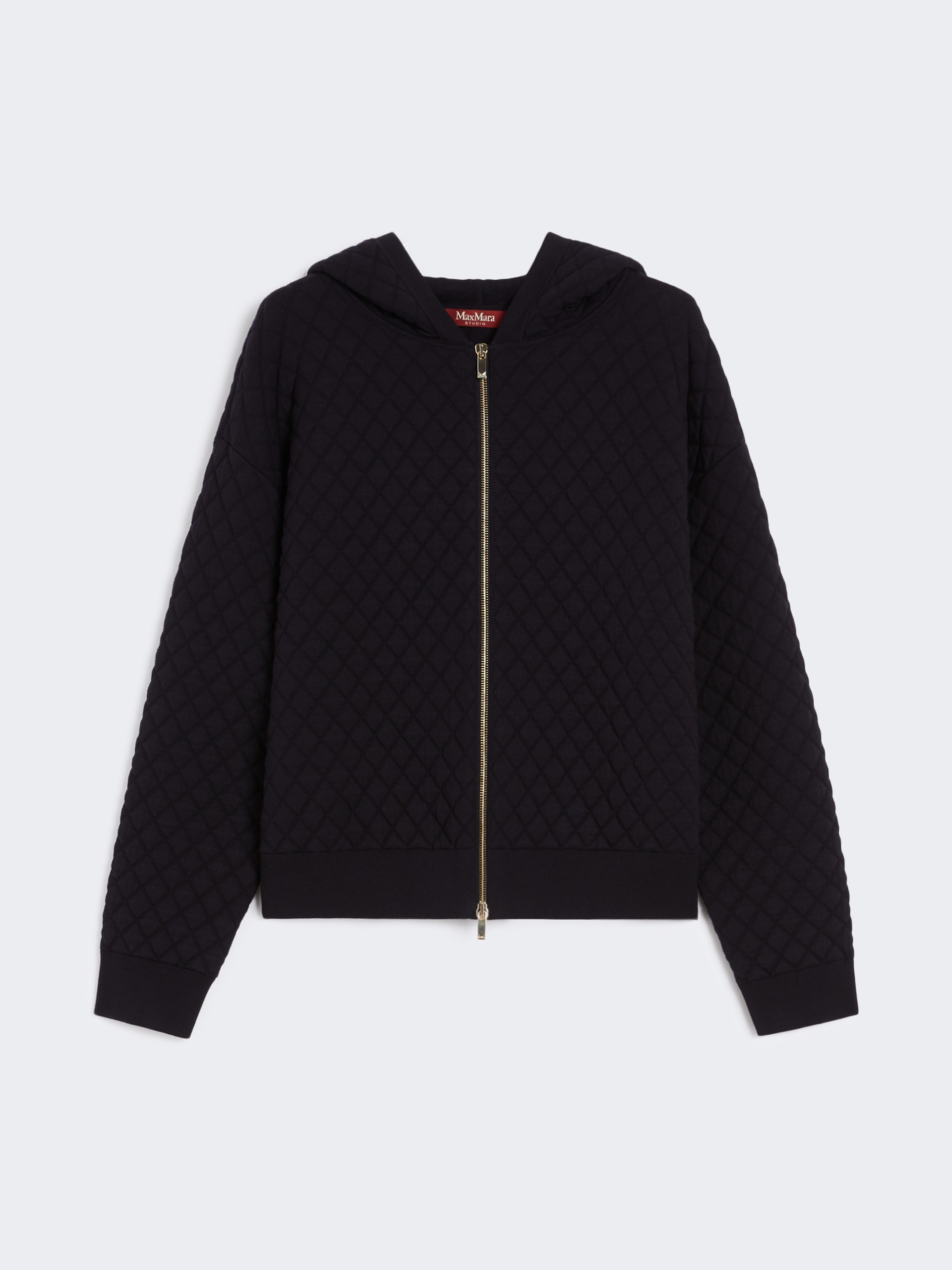 DETAILS Bomber jacket with hood, crafted in a diamond-design quilted effect. Stretch viscose yarn bomber jacket Long sleeves with dropped shoulders Front fastening with double slider zip Inset side pockets with ribbed edges Ribbed cuffs and hem COMPOSITION AND CARE Outer fabric 62% viscose, 38% polyester; inner fabric 62% viscose, 38% polyester; fibre padding 100% polypropylene. Hand wash cold (40°c max); do not bleach; do not tumble dry; flat drying in the shade; cool iron; professionally dry clean perchloroethylene - mild process; do not wet clean.; iron with a cloth between.; using neutral detergent. Distributed by Max Mara S.r.l., registered office in Reggio Emilia (Italy), Via Giulia Maramotti 4, 42124 (IT)
