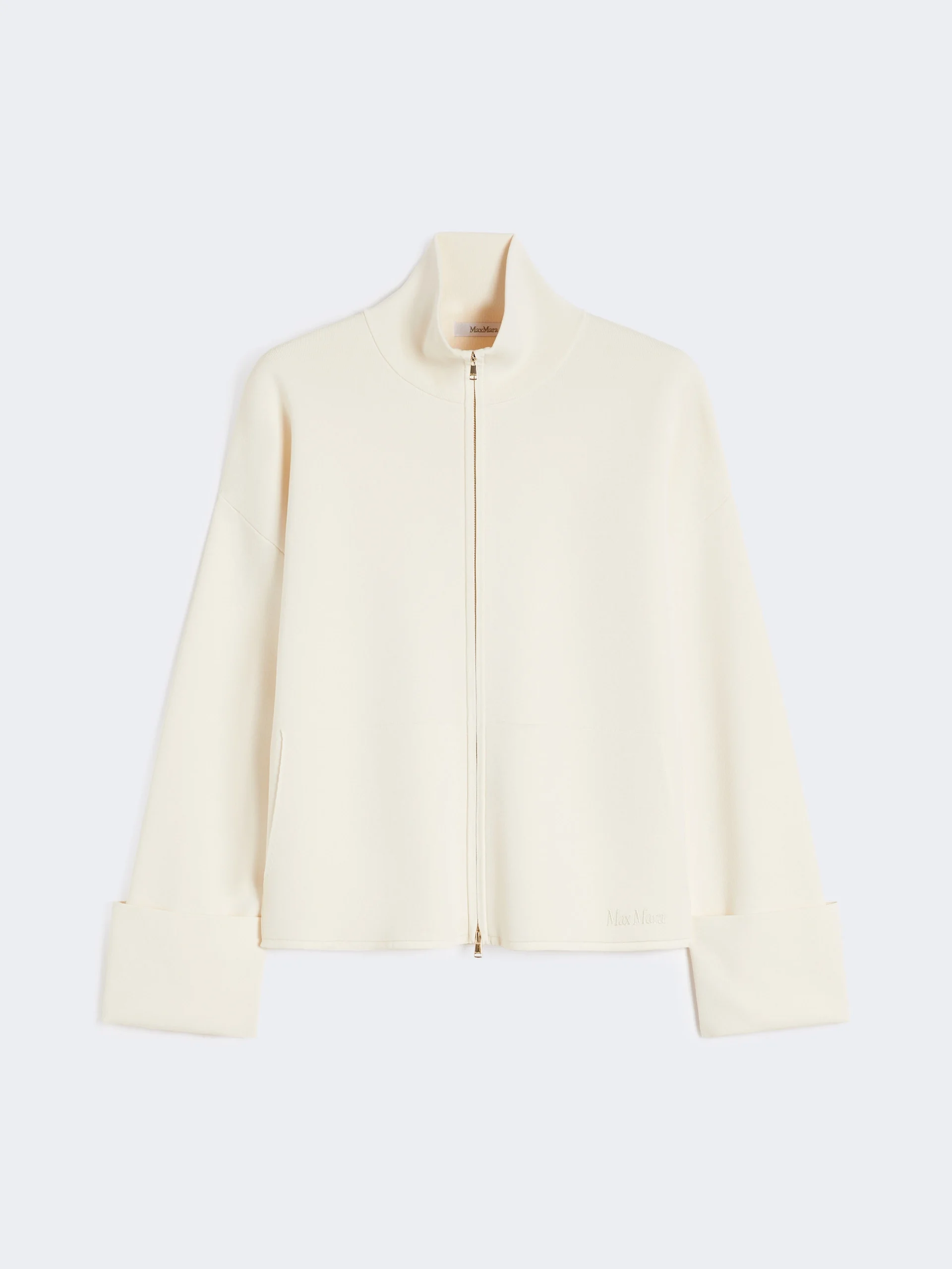 DETAILS Boxy cardigan featuring a high neck and wide cuffs with gold-coloured ball button. - The main fabric of this garment contains at least 50% raw materials derived from wood cellulose, a fibre sourced responsibly from forests - Cardigan made of viscose crepe yarn in an interlock stitch knit - Regular volume with horizontal seam at the back - Long sleeves with dropped shoulders - Front fastening with double slider zip - Patch pockets and embroidered logo on the left side COMPOSITION AND CARE Knitted fabric 65% viscose, 35% polyamide; - exclusive of embroideries. Hand wash cold (40°c max); do not bleach; do not tumble dry; flat drying in the shade; cool iron; professionally dry clean perchloroethylene - mild process; do not wet clean.; iron with a cloth between.; using neutral detergent.; protect buttons before washing.; turn the articles inside out before washing. Distributed by Max Mara S.r.l., registered office in Reggio Emilia (Italy), Via Giulia Maramotti 4, 42124 (IT) Collection: Max Mara Product code: 1341016806001 - MXPFORMATO