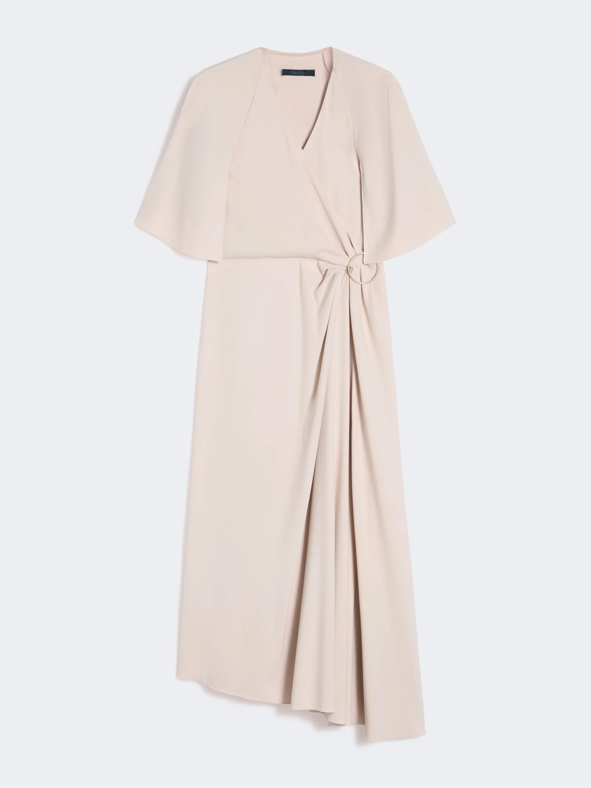 DETAILS Midi dress featuring draped detail at the side and a round metal brooch on the fitted waist. - Dress in stretch viscose envers satin fabric - Flared fit - Criss-cross V-neckline on the front - Cape-look short sleeves with internal dart detail - Side zip fastening - Side dart detail at the waist that protrudes slightly from the hem - Lined model COMPOSITION AND CARE Fabric 97% viscose, 3% elastane; lining 100% polyamide. Do not wash; do not bleach; do not tumble dry; cool iron; professionally dry clean perchloroethylene - mild process; do not wet clean.; remove the brooche before washing. Distributed by Max Mara S.r.l., registered office in Reggio Emilia (Italy), Via Giulia Maramotti 4, 42124 (IT) Collection: Max Mara Product code: 1221086406003 - MXECUPOLA