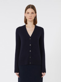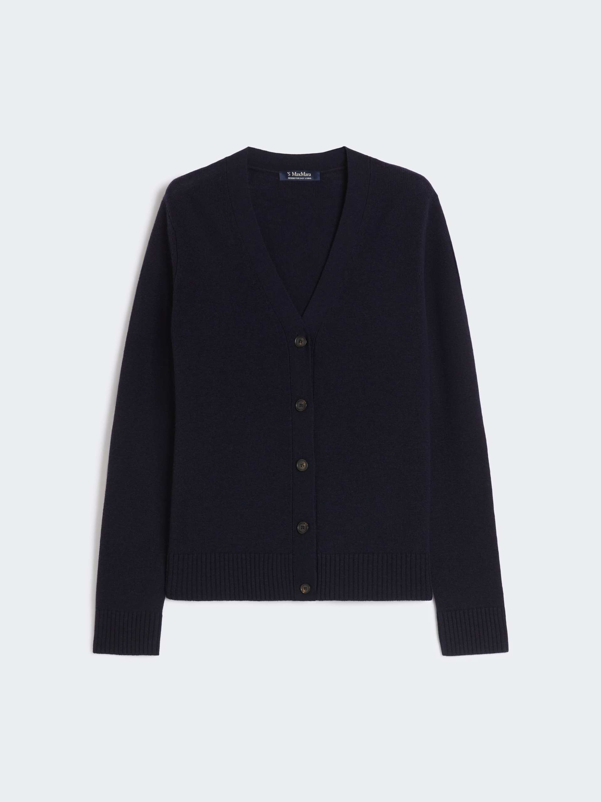 DETAILS Mannish cardigan featuring camel-coloured knitted elbow patches, complete with embossed Max Mara logo detail. - Pure wool yarn cardigan - Relaxed fit - V-neck - Drop-shoulder long sleeves - Front fastening comprising 4-hole horn buttons - Rib-knit cuffs and trim COMPOSITION AND CARE 100% wool. Hand wash cold; do not bleach; do not tumble dry; flat drying in the shade; cool iron; professionally dry clean perchloroethylene - mild process; do not wet clean.; iron with a cloth between.; using neutral detergent.; turn the articles inside out before washing.; to be ironed on reverse.; do not iron the decoration. Distributed by Max Mara S.r.l., registered office in Reggio Emilia (Italy), Via Giulia Maramotti 4, 42124 (IT)