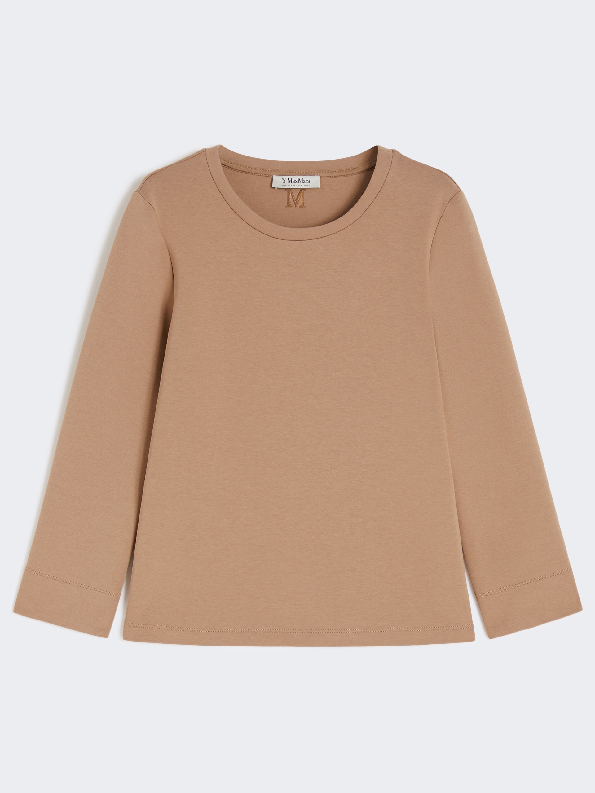 DETAILS Basic T-shirt embellished with the M Monogram logo embroidered in thread on the back of the neck. Technical cotton scuba jersey T-shirt Straight cut Crew neck Long set-in sleeves Straight hem COMPOSITION AND CARE Jersey fabric 78% cotton, 16% polyester, 6% elastane; - exclusive of embroideries. Hand wash cold (40°c max); do not bleach; do not tumble dry; flat drying in the shade; cool iron; professionally dry clean perchloroethylene - mild process; do not wet clean.; iron with a cloth between.; using neutral detergent.; don’t rub.; turn the articles inside out before washing.; to be ironed on reverse. Distributed by Max Mara S.r.l., registered office in Reggio Emilia (Italy), Via Giulia Maramotti 4, 42124 (IT)