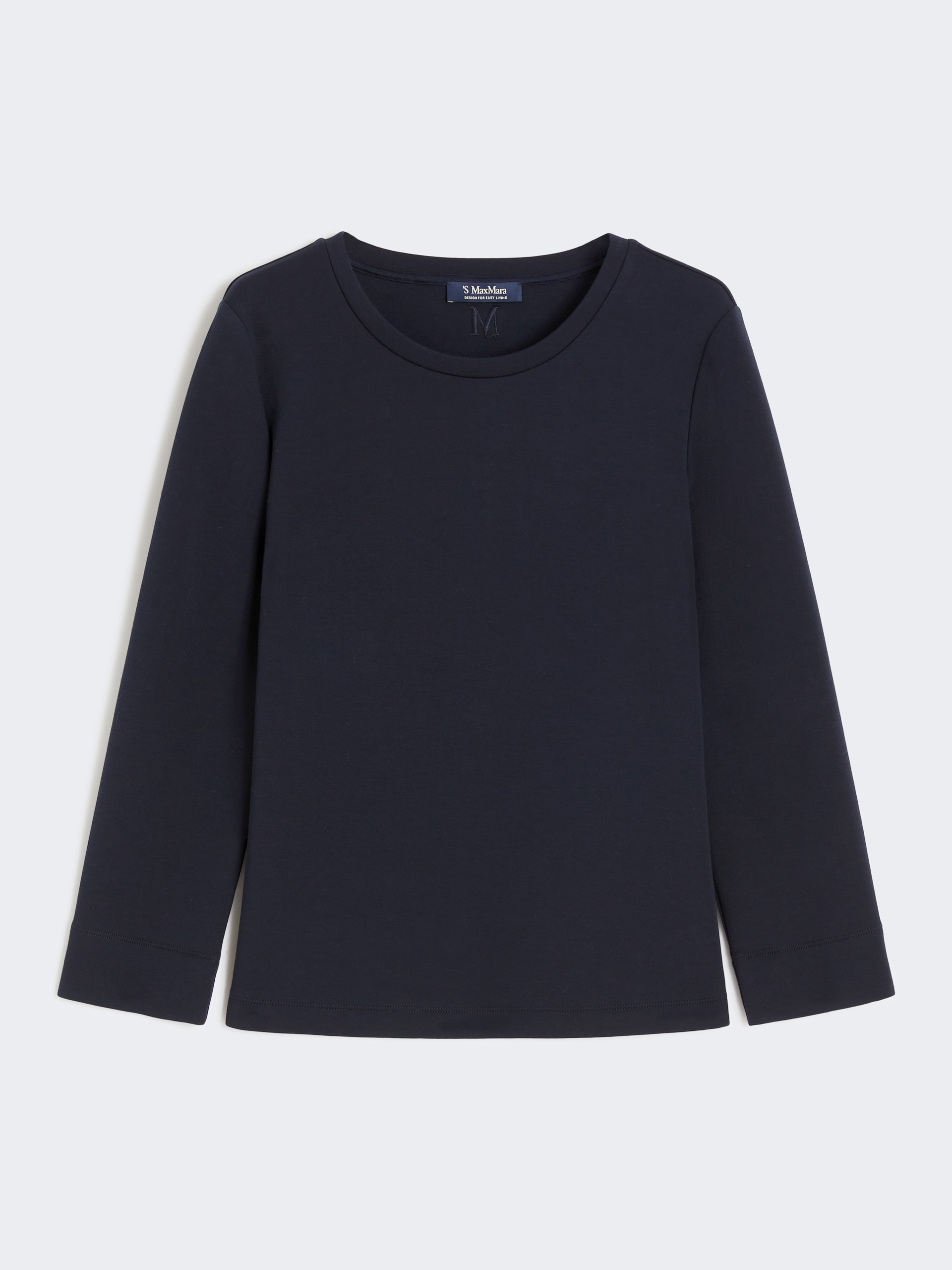 DETAILS Basic T-shirt embellished with the M Monogram logo embroidered in thread on the back of the neck. - Technical cotton scuba jersey T-shirt - Straight cut - Crew neck - Long set-in sleeves - Straight hem COMPOSITION AND CARE Jersey fabric 78% cotton, 16% polyester, 6% elastane; - exclusive of embroideries. Hand wash cold; do not bleach; do not tumble dry; flat drying in the shade; cool iron; professionally dry clean perchloroethylene - mild process; do not wet clean.; iron with a cloth between.; using neutral detergent.; don’t rub.; turn the articles inside out before washing.; to be ironed on reverse. Distributed by Max Mara S.r.l., registered office in Reggio Emilia (Italy), Via Giulia Maramotti 4, 42124 (IT)