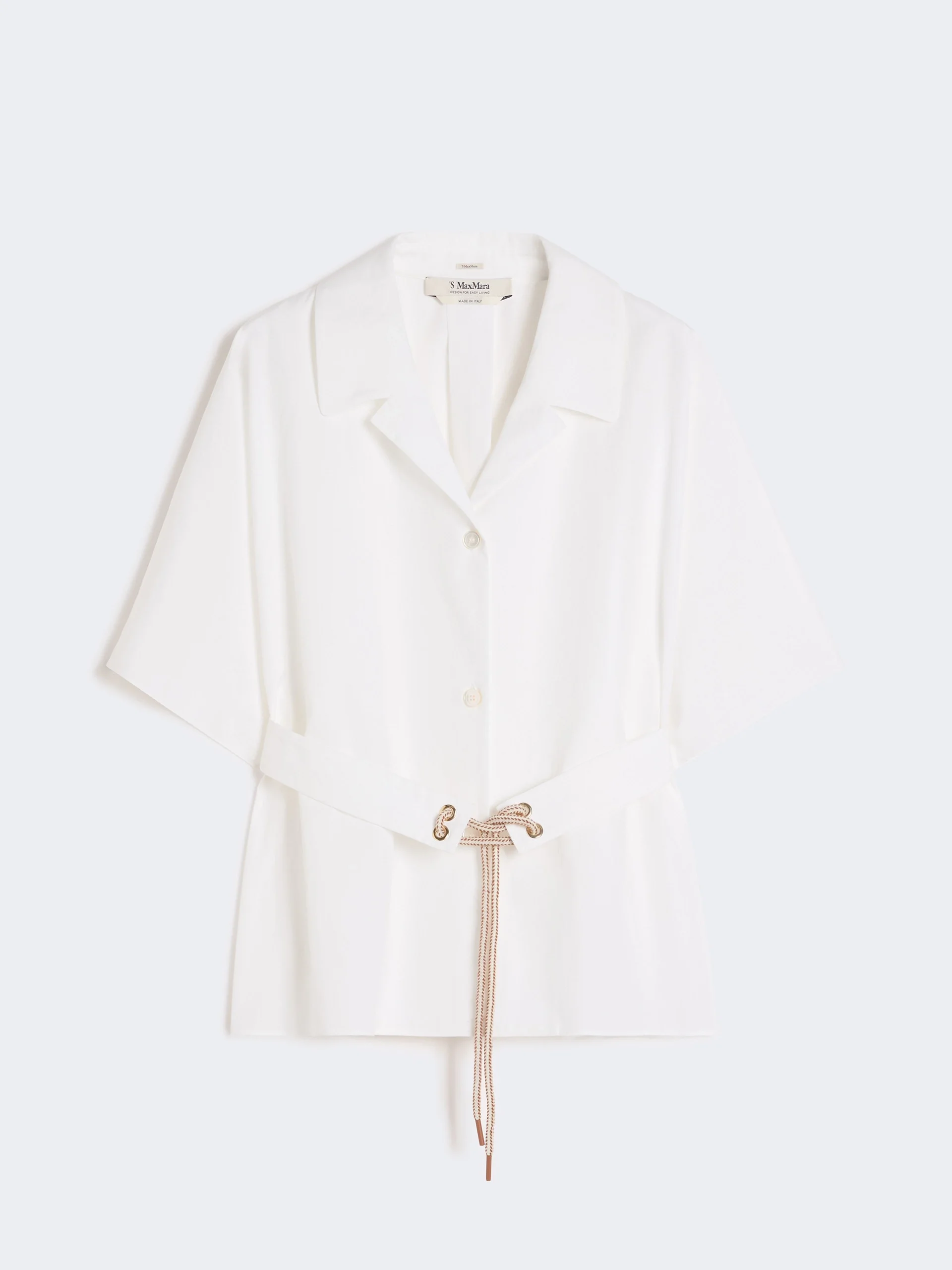 DETAILS Short-sleeved shirt featuring a fabric belt, complete with metal eyelets and two-tone cord detail. - Shirt in pure cotton poplin fabric - Straight fit - Small lapel collar - Wide kimono sleeves - Mother-of-pearl button fastening on the front - Deep central pleat at the back COMPOSITION AND CARE Fabric 100% cotton; - exclusive of decoration. Machine wash cold delicate cycle; do not bleach; do not tumble dry; line drying in the shade; cool iron; professionally dry clean perchloroethylene - mild process.; wash the garment while it is fastened.; turn the articles inside out before washing.; remove the belt before washing.; contains non-textile parts of animal origin. Distributed by Max Mara S.r.l., registered office in Reggio Emilia (Italy), Via Giulia Maramotti 4, 42124 (IT) Collection: 'S Max Mara Product code: 9111096306060 - SMMCARISMA