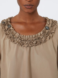 DETAILS Blouse with double row of ruffles around the neckline embellished with three removable jewel appliques. - Washed pure cotton poplin blouse - Slightly flared line - Crew neckline - Wide three-quarter puffed raglan sleeves - Gathered cuffs COMPOSITION AND CARE Fabric 100% cotton; - exclusive of decoration. Machine wash cold delicate cycle; do not bleach; do not tumble dry; line drying in the shade; cool iron; professionally dry clean perchloroethylene - mild process.; remove the decorations before washing. Distributed by Max Mara S.r.l., registered office in Reggio Emilia (Italy), Via Giulia Maramotti 4, 42124 (IT)