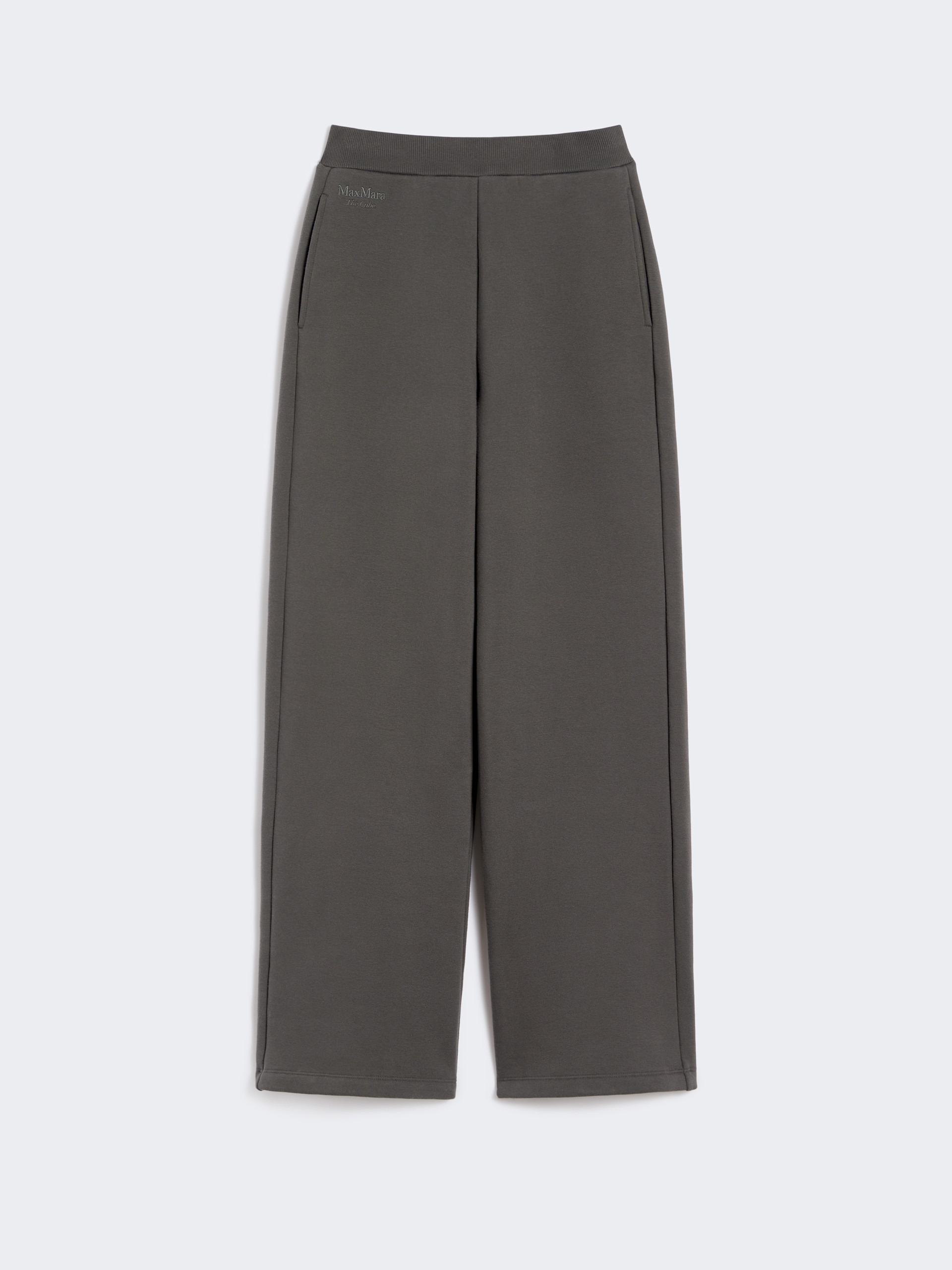 DETAILS Relaxed-fit trousers. Brushed cotton jersey trousers Ribbed elasticated waistband Side pockets Welt pocket on the rear right-hand side Small embroidered logo above the right pocket COMPOSITION AND CARE Jersey fabric 88% cotton, 8% polyamide, 4% elastane; - exclusive of embroideries. Machine wash cold delicate cycle; do not bleach; do not tumble dry; flat drying in the shade; cool iron; professionally dry clean perchloroethylene - mild process; professional wet cleaning - very mild process.; iron with a cloth between.; using neutral detergent.; turn the articles inside out before washing.; to be ironed on reverse. Distributed by Max Mara S.r.l., registered office in Reggio Emilia (Italy), Via Giulia Maramotti 4, 42124 (IT)